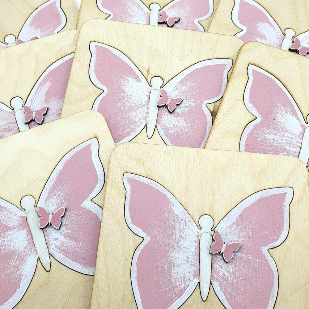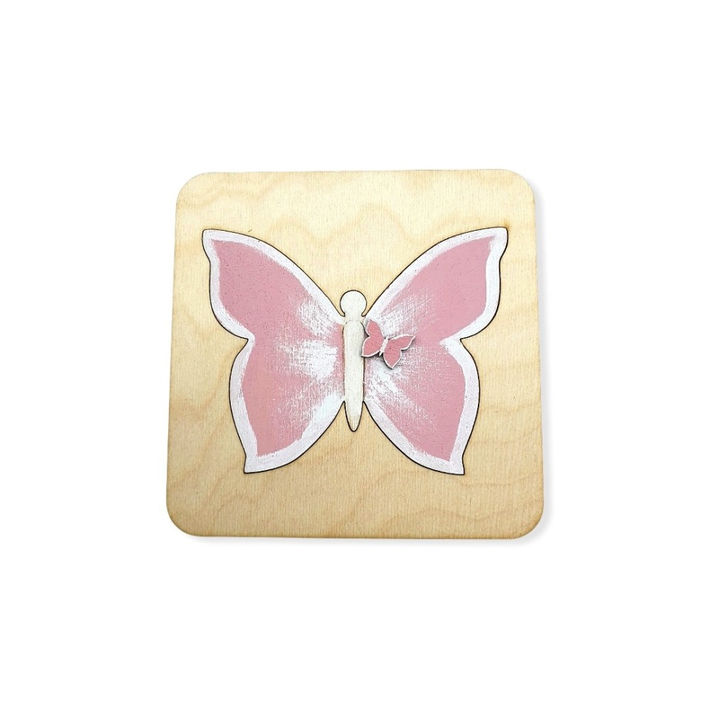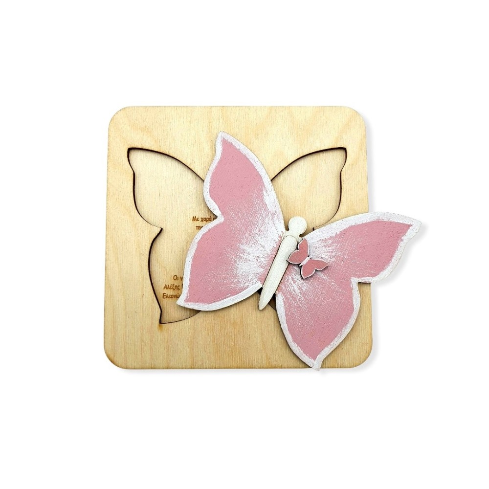 Πρωτότυπο και μοναδικό ξύλινο προσκλητήριο βάπτισης παζλ σε σχέδιο πεταλούδα. Αφαιρούμε την πεταλούδα και ανακαλύπτουμε χαραγμένο το κειμενάκι πρόσκλησης μαζί με τα στοιχεία της βάπτισης, βάζουμε την πεταλούδα στην θέση της και δημιουργούμε ένα όμορφο παιδικό διακοσμητικό!