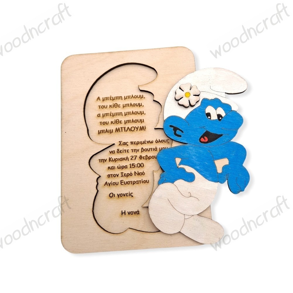 Πρωτότυπο και μοναδικό ξύλινο προσκλητήριο βάπτισης παζλ σε σχέδιο στρουμφάκι. Αφαιρούμε το στρουμφάκι και ανακαλύπτουμε χαραγμένο το κειμενάκι πρόσκλησης μαζί με τα στοιχεία της βάπτισης, βάζουμε το στρουμφάκι στην θέση του και δημιουργούμε ένα όμορφο παιδικό διακοσμητικό!