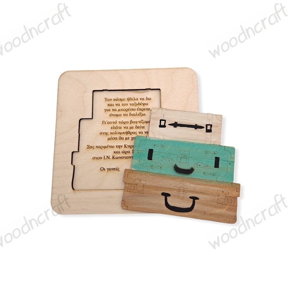 Πρωτότυπο και μοναδικό ξύλινο προσκλητήριο βάπτισης παζλ σε σχέδιο βαλίτσες. Αφαιρούμε την φιγούρα και ανακαλύπτουμε χαραγμένο το κειμενάκι πρόσκλησης μαζί με τα στοιχεία της βάπτισης, την τοποθετούμε ξανά στην θέση της και δημιουργούμε ένα όμορφο διακοσμητικό!