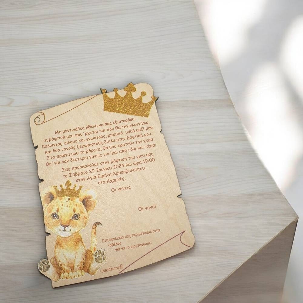 Προσκαλέστε τους αγαπημένους σας με στυλ και φινέτσα με το ξύλινο προσκλητήριο πάπυρος - Λιονταράκι με Κορώνα. Ιδανικό για βάπτιση ή παιδικά γενέθλια, αυτό το προσκλητήριο συνδυάζει την κλασική γοητεία του πάπυρου με την χαριτωμένη εικόνα ενός λιονταριού που φοράει κορώνα.