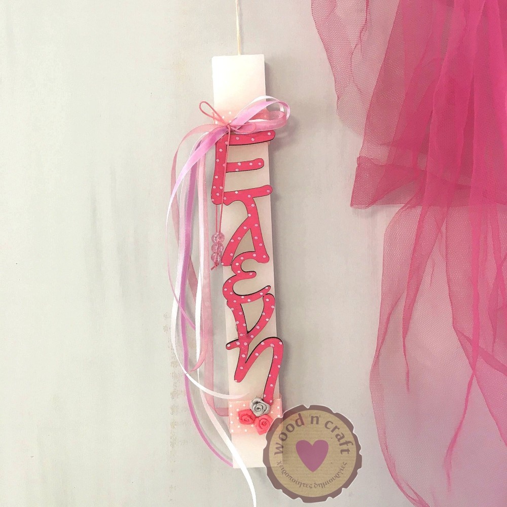 Χειροποίητη αρωματική πασχαλινή λαμπάδα διακοσμημένη με λουλουδάκια και με ξύλινο κάθετο όνομα βαμμένο στο χρώμα της επιλογής σας!