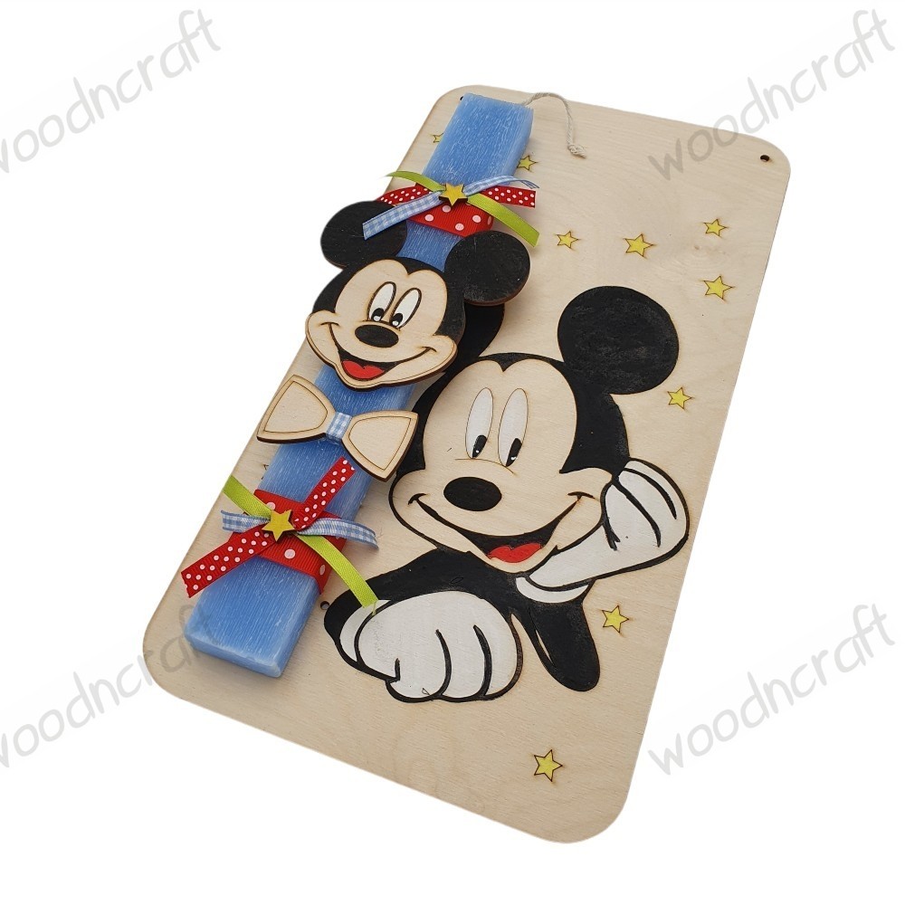 Πρωτότυπη χειροποίητη πασχαλινή λαμπάδα σε σετ με βάση που γίνεται καδράκι, διακοσμημένη με κορδελάκια και τον αγαπημένο Μίκυ με ένα ξύλινο παπιγιόν! Στην βάση μπορεί να μπει το όνομα της επιλογής σας.