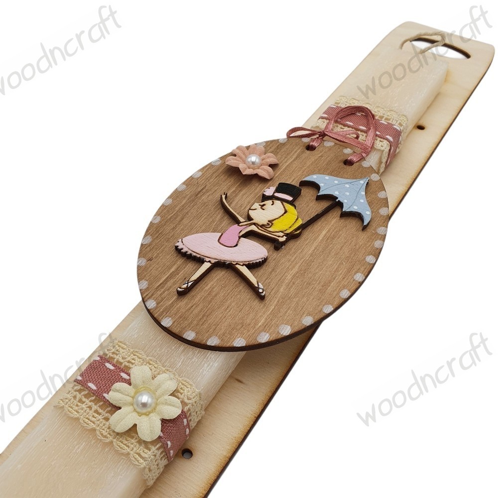 Πρωτότυπη χειροποίητη πασχαλινή λαμπάδα στολισμένη με κορδελάκια, λουλουδάκι και ξύλινο διακοσμητικό καδράκι με ένα κοριτσάκι που κρατάει μία ομπρέλα!