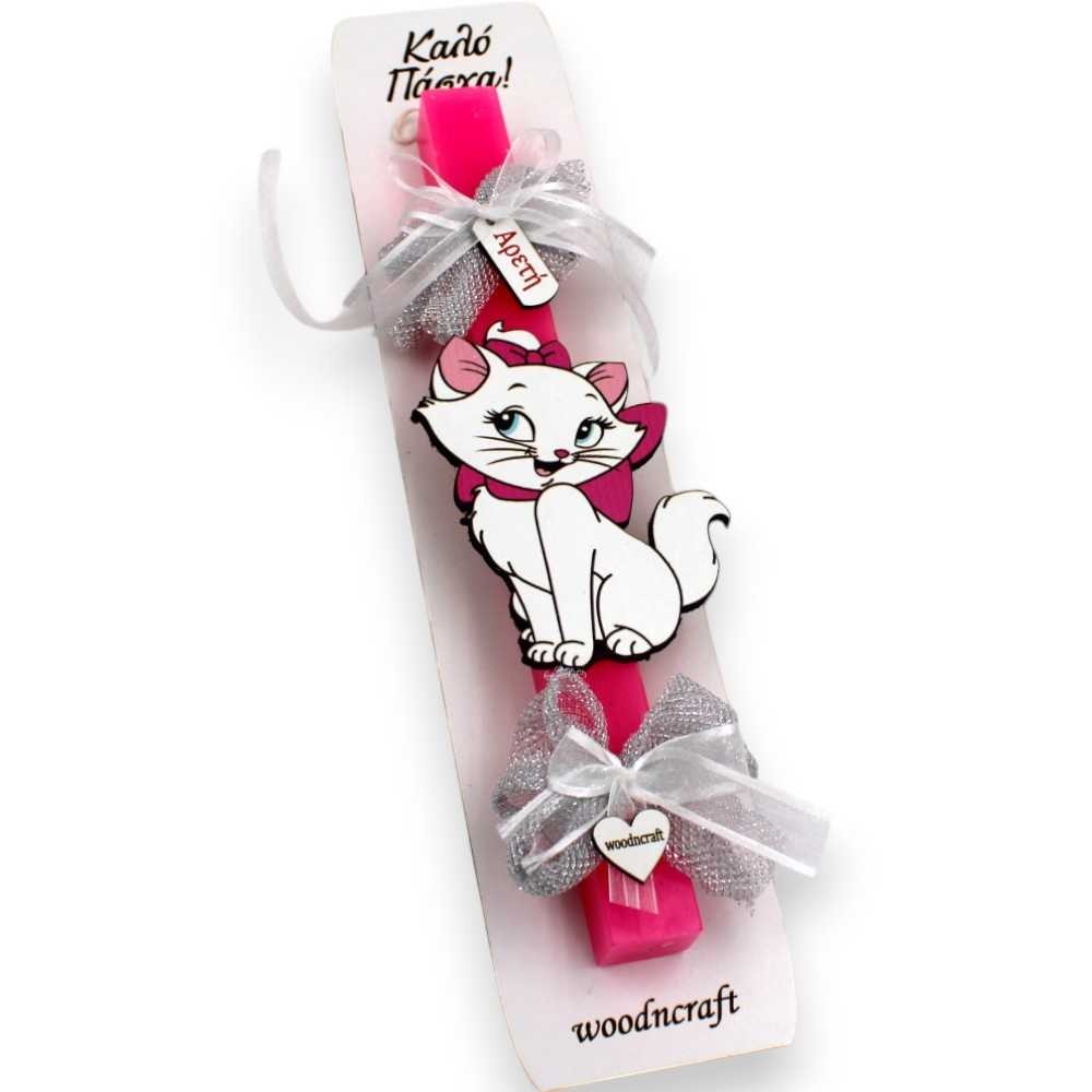 Πρωτότυπη πασχαλινή λαμπάδα διακοσμημένη με κορδέλες, ταμπελάκι με το όνομα του παιδιού και ξύλινη φιγούρα με την Μαρί την γατούλα!