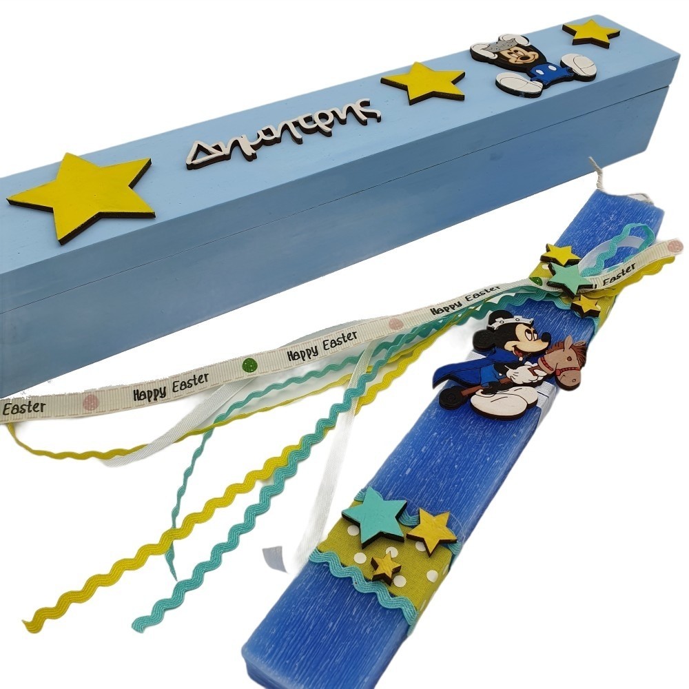 Χειροποίητη αρωματική λαμπάδα διακοσμημένη με κορδελάκια και ξύλινη φιγούρα Μίκυ Μάους πρίγκιπα... Σετ με ξύλινο κουτί, διακοσμημένο με αστέρια, δύο φιγούρες Μίκυ και φυσικά το όνομα της επιλογής σας!