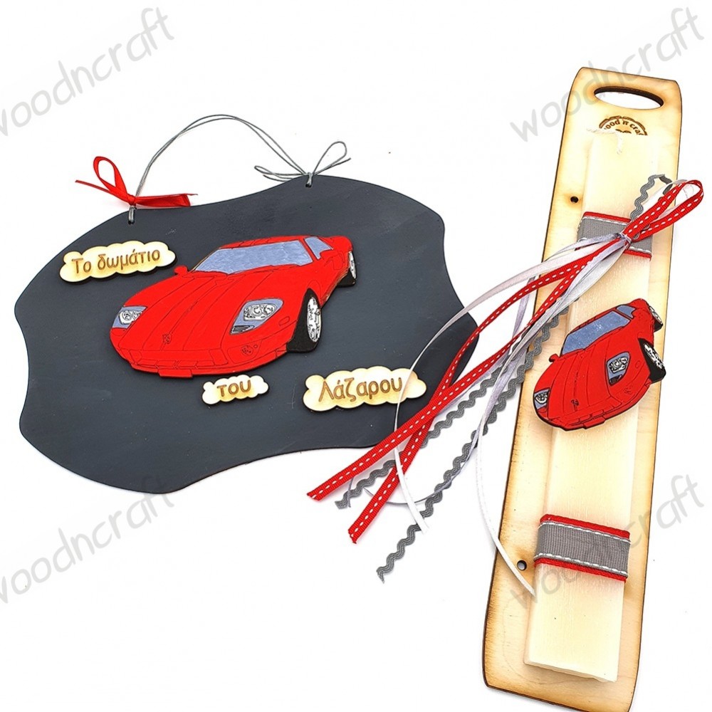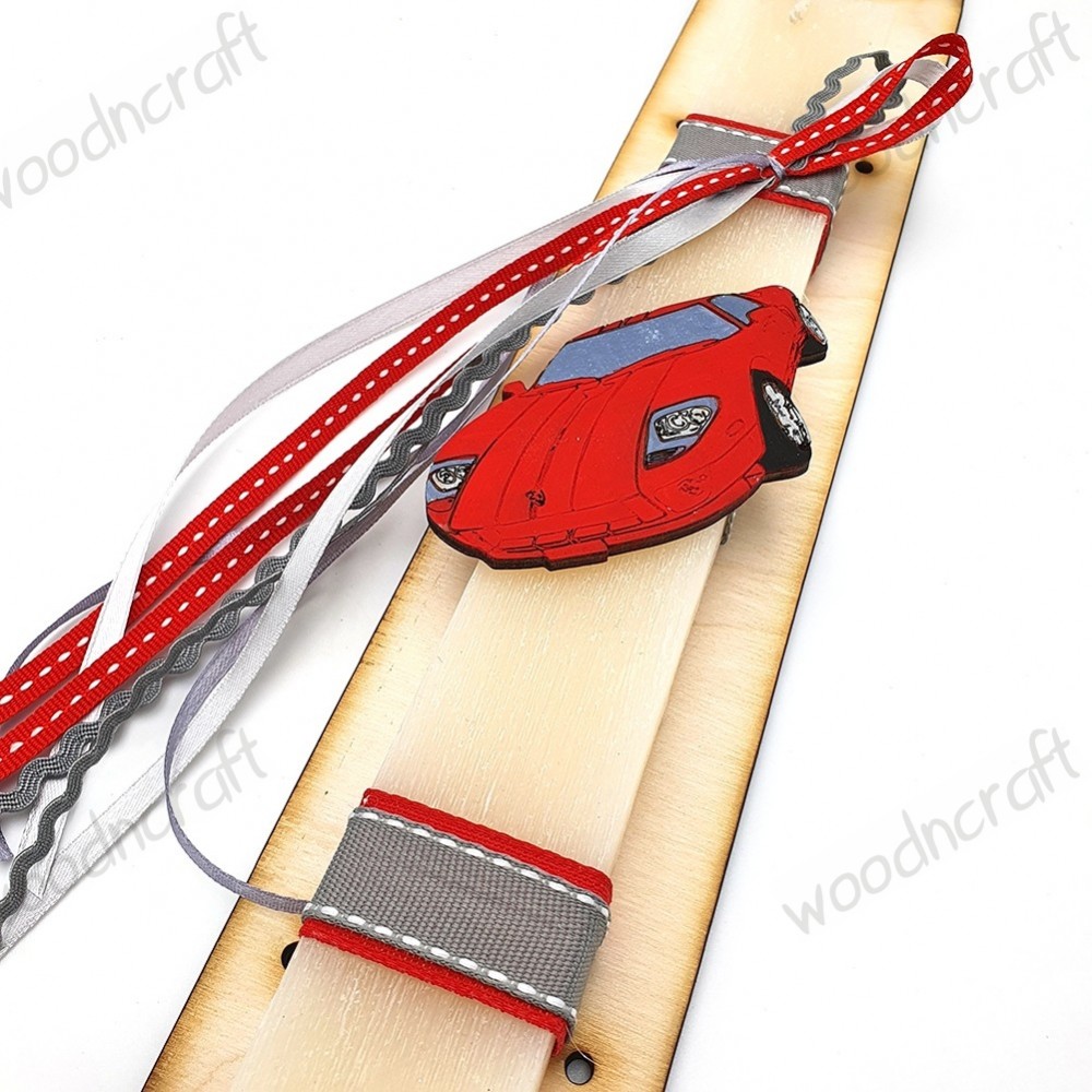 Πρωτότυπη και ξεχωριστή χειροποίητη πασχαλινή λαμπάδα με ξύλινη φιγούρα ferrari σετ με καδράκι για το παιδικό δωμάτιο με το όνομα του παιδιού!