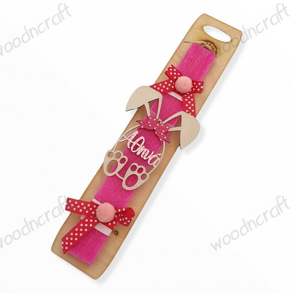 Πρωτότυπη χειροποίητη πασχαλινή λαμπάδα διακοσμημένη με κορδελάκια, πον πον και ξύλινο διακοσμητικό διάτρητο κουνελάκι με προσαρμοσμένο φιογκάκι και φυσικά το όνομα της επιλογής σας!