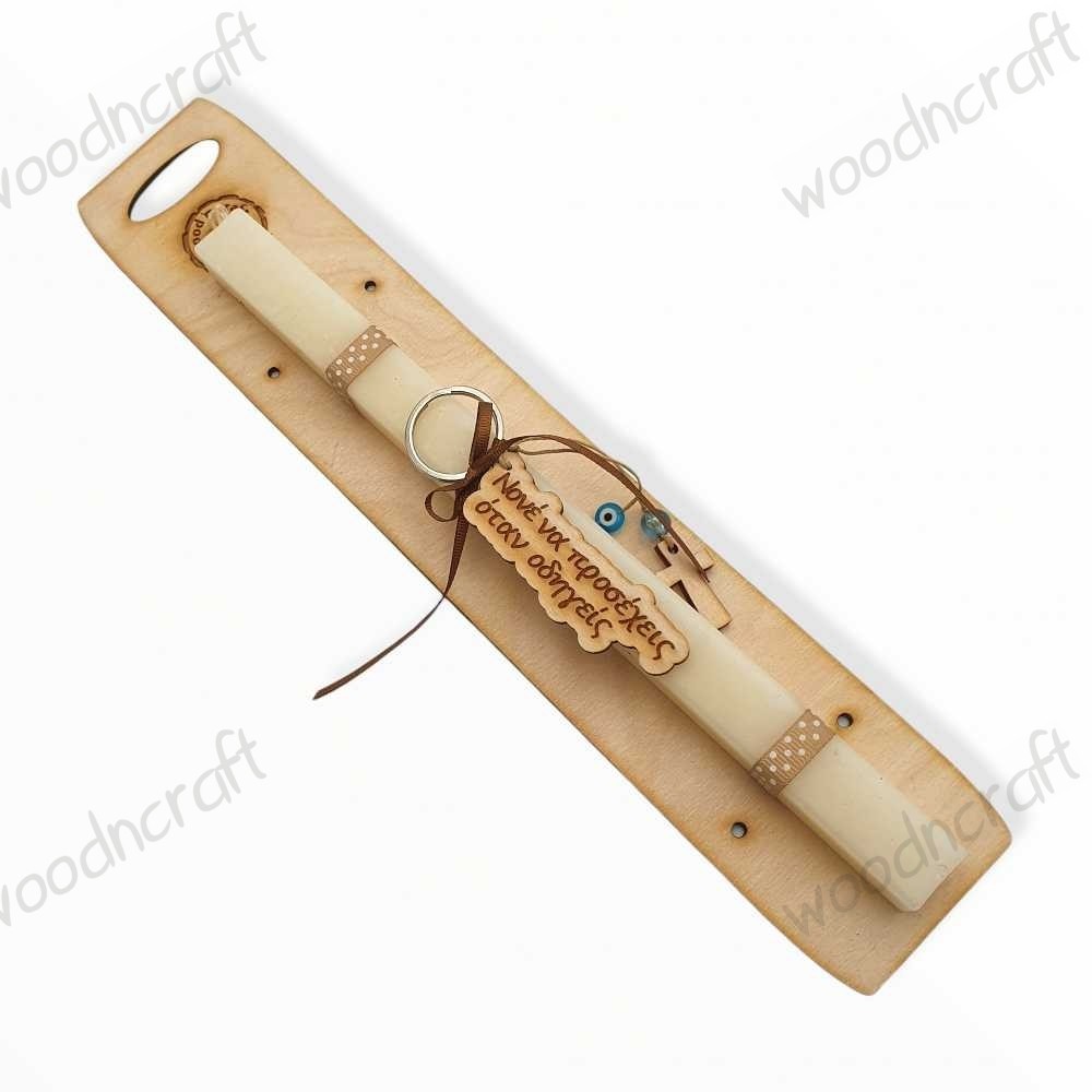 Πρωτότυπη πασχαλινή λαμπάδα διακοσμημένη με κορδελάκια και ξύλινο χειροποίητο μπρελόκ με αφιέρωση νονέ να προσέχεις όταν οδηγείς!