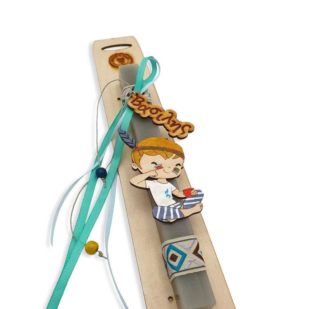 Πρωτότυπη χειροποίητη πασχαλινή λαμπάδα διακοσμημένη με κορδελάκια που έχουν δεμένο επάνω το όνομα της επιλογής σας, με χρωματιστές χάντρες και την ξύλινη φιγούρα ενός μικρού ινδιάνου.