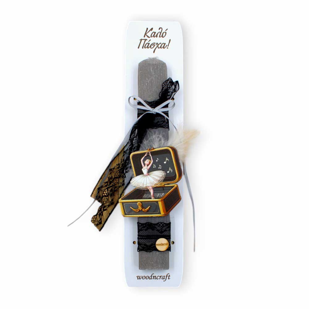 Η πλακέ, αρωματική λαμπάδα των 25 εκ. είναι διακοσμημένη με μια πανέμορφη ξύλινη φιγούρα μουσικού κουτιού, όπου μια μπαλαρίνα χορεύει με χάρη, τυπωμένη με τεχνική UV σε διάσταση 10 εκ.
