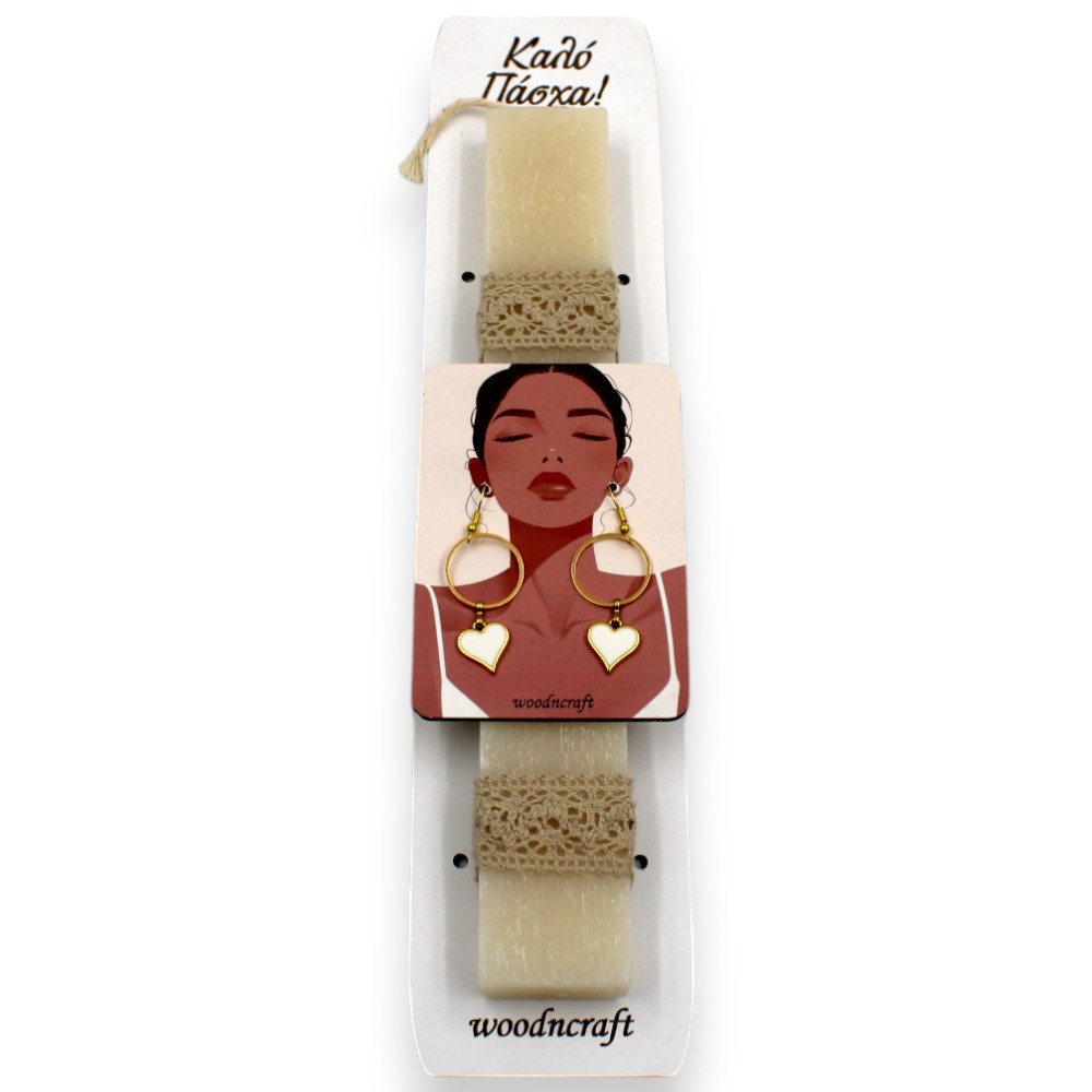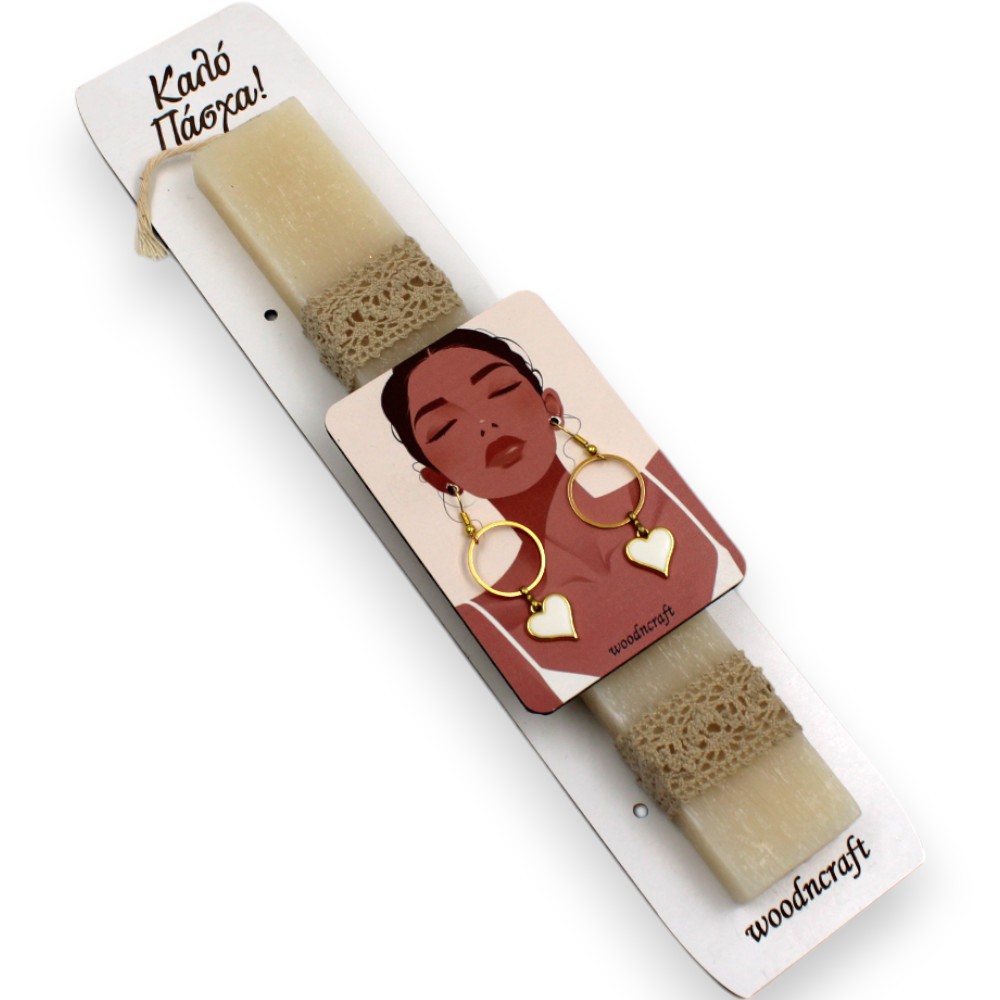 Το highlight αυτής της λαμπάδας είναι το μοναδικό δώρο που τη συνοδεύει: ένα ζευγάρι χειροποίητα σκουλαρίκια σε επιχρυσωμένο μεταλλικό κρικάκι και πεταλούδα με σμάλτο.