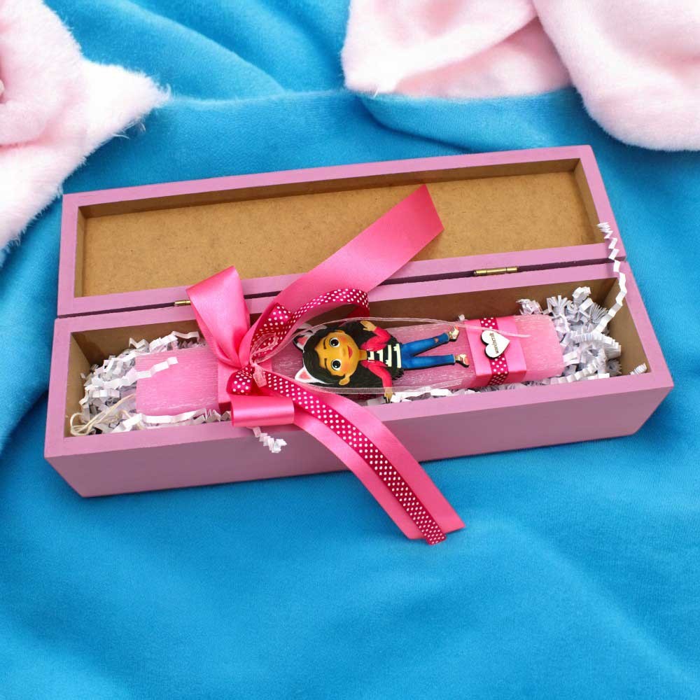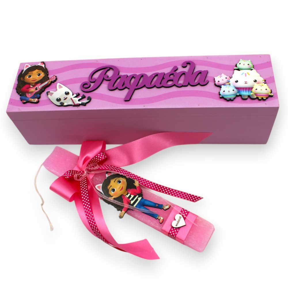 Η λαμπάδα συνοδεύεται από ένα πολυτελές ξύλινο κουτί, διακοσμημένο με ξύλινες εκτυπωμένες φιγούρες από τον κόσμο της Γκάμπι, καθώς και το όνομα του παιδιού, κάνοντάς το μοναδικό και προσωπικό δώρο.