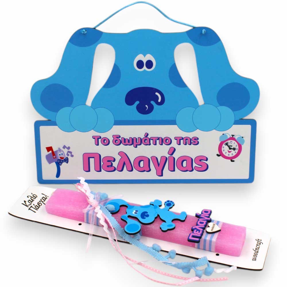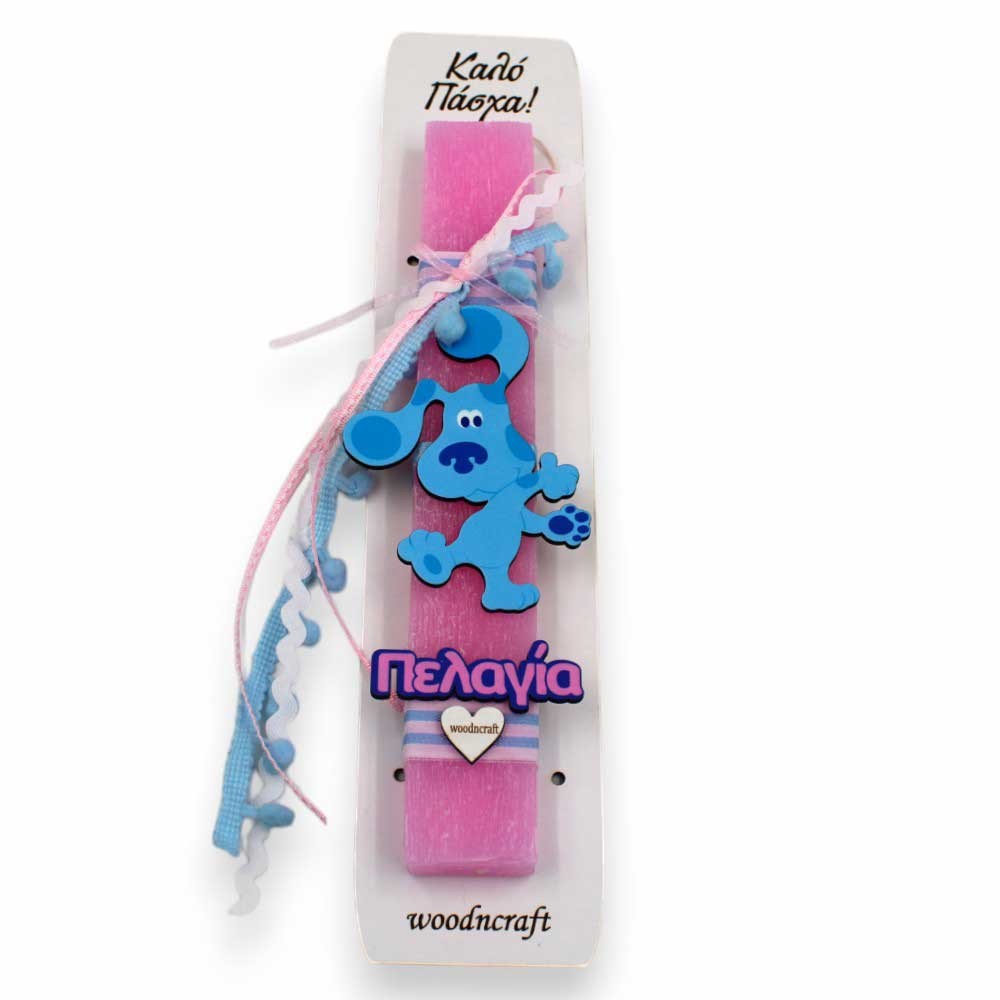 Η πλακέ, αρωματική λαμπάδα των 25 εκ. έρχεται σε απαλό ροζ χρώμα, στολισμένη με μια υπέροχη ξύλινη εκτυπωμένη φιγούρα της σκυλίτσας Μπλου στα 10 εκ. και το όνομα του παιδιού.
