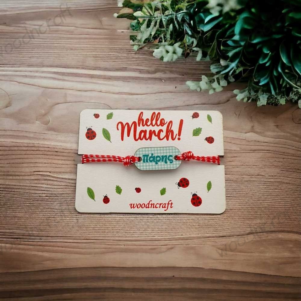 Αυτό το μαρτάκι έχει μια ξύλινη βάση διαμέτρου 7 εκατοστών, που προσθέτει έναν εκλεπτυσμένο και φυσικό χαρακτήρα. Η ζεστή υφή του ξύλου συνδυάζεται άψογα με την εντυπωσιακή επιγραφή του ονόματός σας, δημιουργώντας ένα ολοκληρωμένο και εκλεπτυσμένο κομμάτι κόσμηματος.