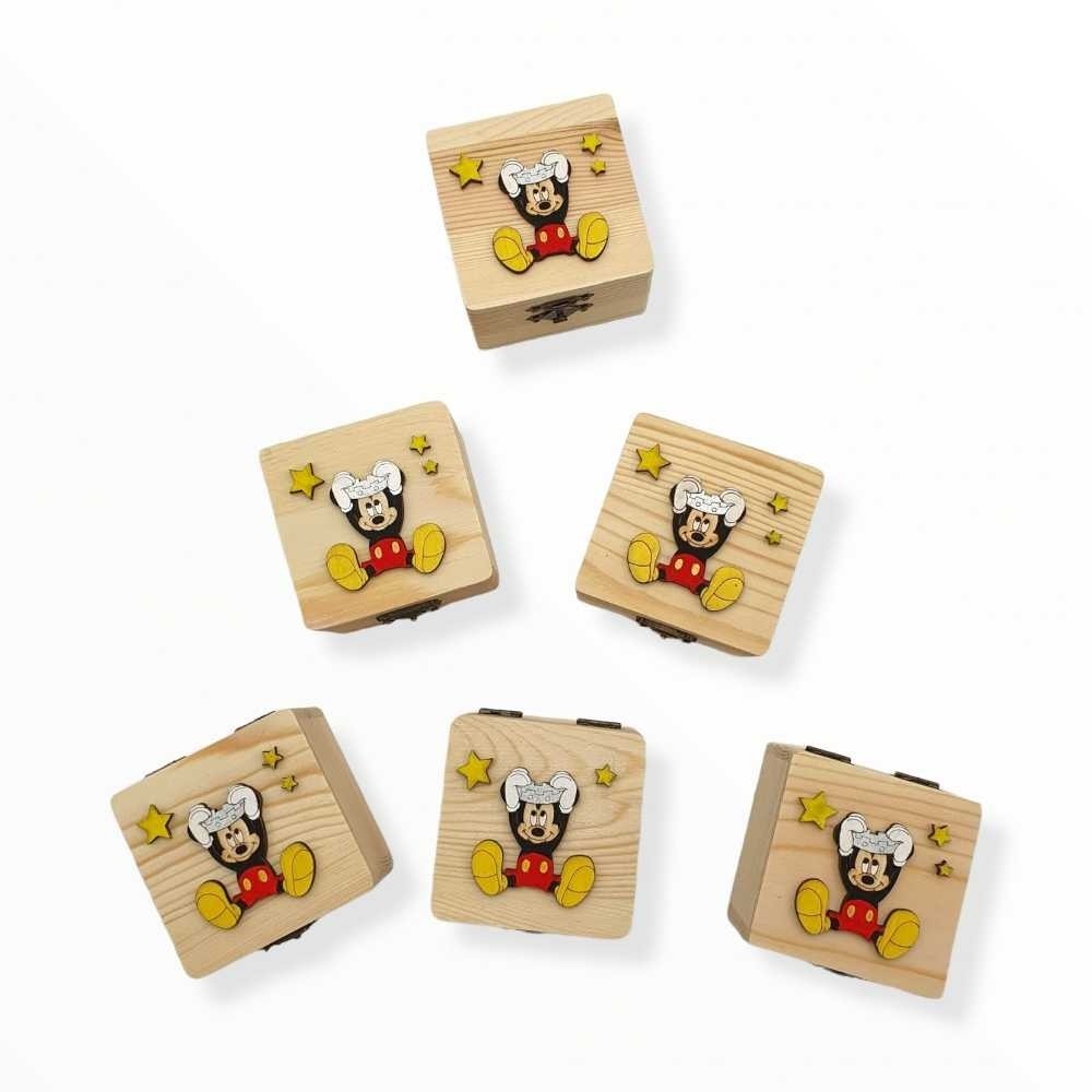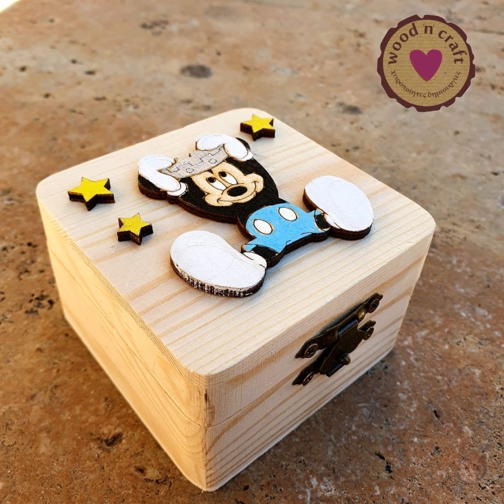 Ξεχωριστή χειροποίητη μπομπονιέρα βάφτισης σε ξύλινο κουτάκι διακοσμημένο με τον αγαπημένο Μίκυ πρίγκιπα και μικρά κίτρινα αστεράκια! Περιέχει πέντε κουφέτα της επιλογής σας περασμένα σε λευκό τούλι!