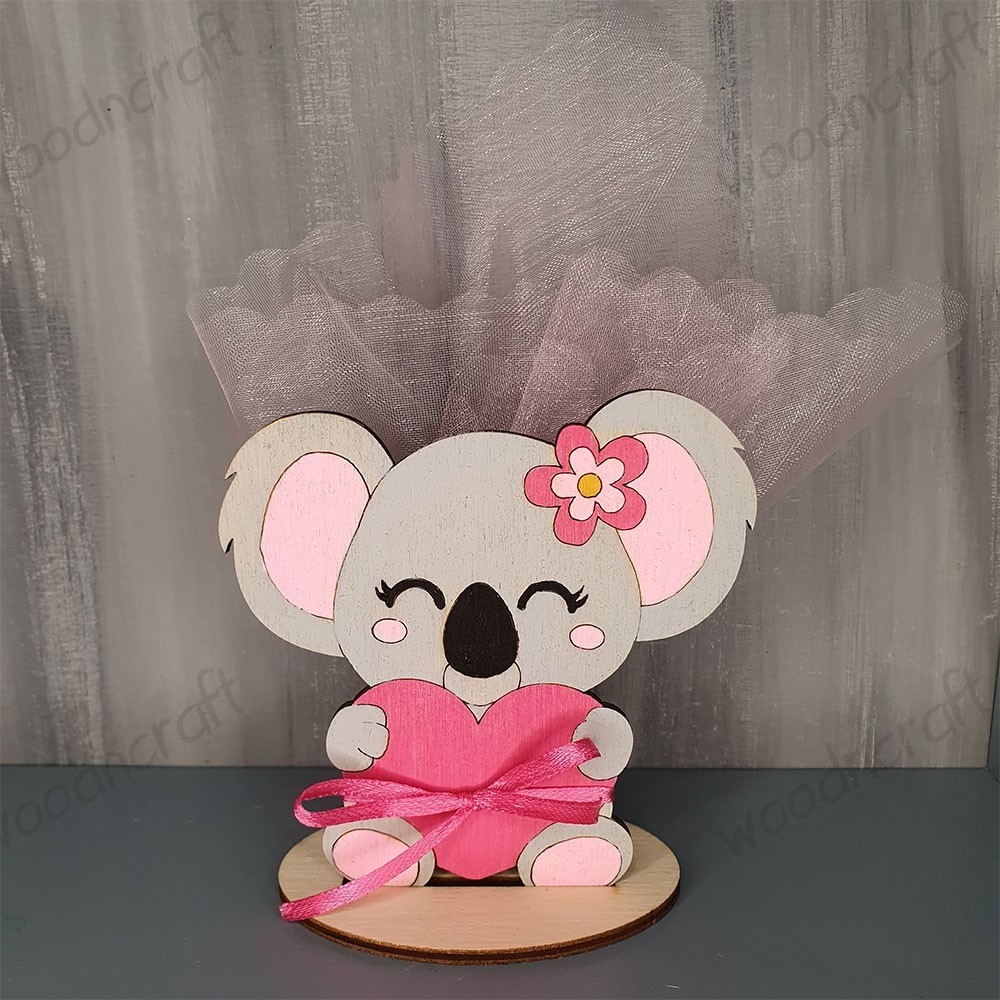 Πρωτότυπη χειροποίητη μπομπονιέρα βάφτισης με ξύλινη φιγούρα κοάλα σε βάση, με τρία κουφέτα της επιλογής σας τυλιγμένα σε τούλι, δεμένο με κορδέλα φιογκάκι!