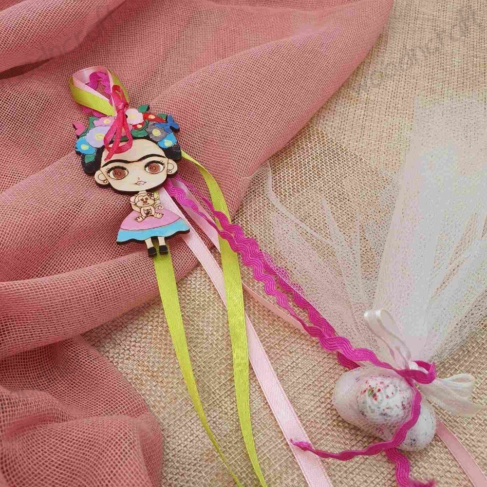 Χειροποίητη κρεμαστή μπομπονιέρα βάφτισης διακοσμημένη με χρωματιστά κορδελάκια και την ξύλινη φιγούρα της Φρίντα Κάλο κοριτσάκι, στα χρώματα της επιλογής σας! Μία μοναδική και πρωτότυπη ιδέα βάφτισης για να ξεχωρίσετε!!!