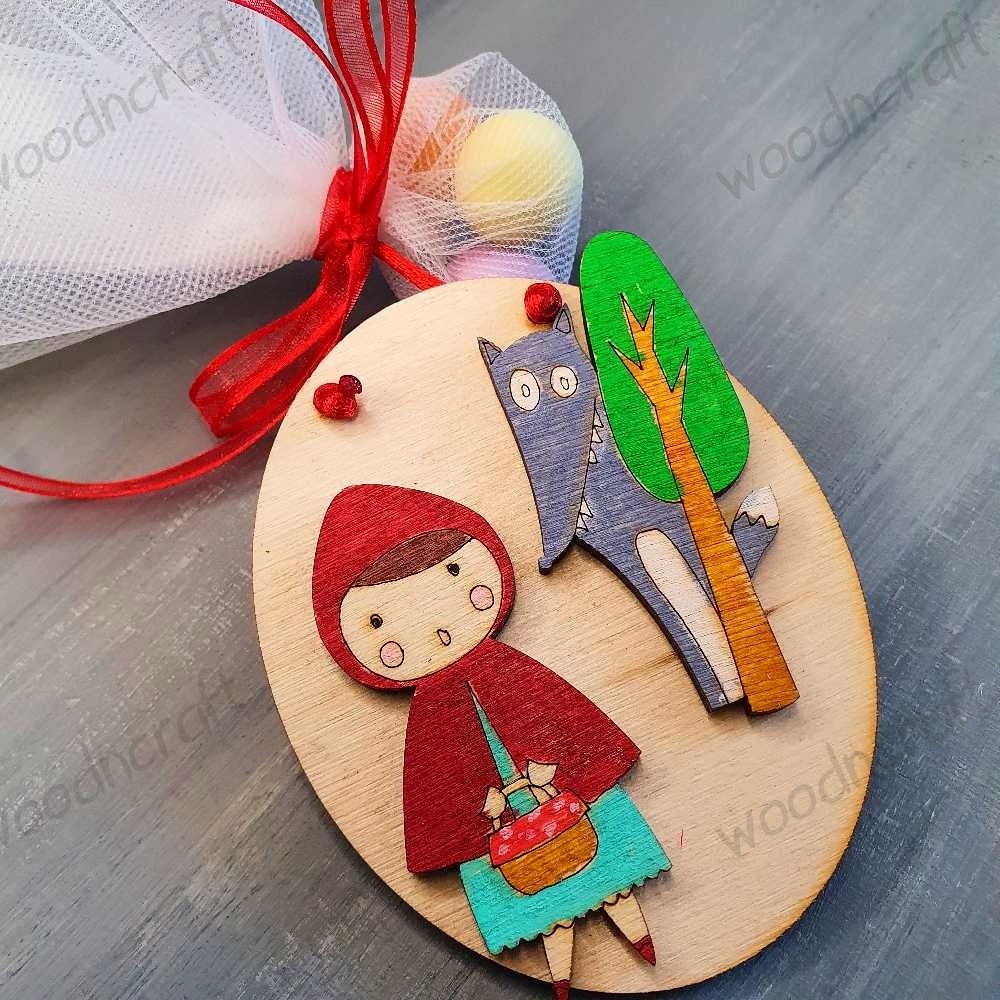 Χειροποίητη μπομπονιέρα βάφτισης με ξύλινο διακοσμητικό καδράκι με την Κοκκινοσκουφίτσα και τον κακό λύκο! Περιέχει τρία κουφέτα της επιλογής σας, δεμένα σε τούλι με κορδελάκι. Η πιο ξεχωριστή χειροποίητη μπομπονιέρα με τους ήρωες του αγαπημένου παιδικού παραμυθιού που σίγουρα θα κλέψει τις εντυπώσεις!
