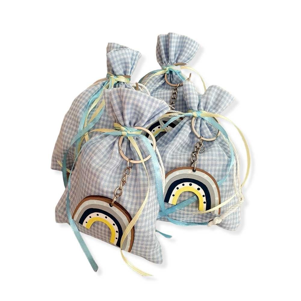 Ξεχωριστή χειροποίητη μπομπονιέρα βάφτισης σε γαλάζιο καρό υφασμάτινο πουγκί διακοσμημένο με κορδελάκια και ξύλινο μπρελόκ ουράνιο τόξο!