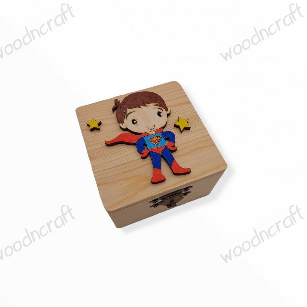 Ξεχωριστή χειροποίητη μπομπονιέρα βάφτισης σε ξύλινο κουτάκι διακοσμημένο με ένα αγοράκι σούπερ ήρωα και μικρά κίτρινα αστεράκια! Περιέχει πέντε κουφέτα της επιλογής σας περασμένα σε λευκό τούλι!