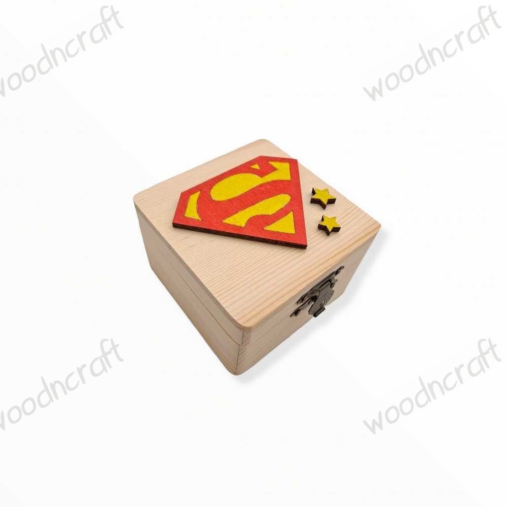 Ξεχωριστή χειροποίητη μπομπονιέρα βάφτισης σε ξύλινο κουτάκι διακοσμημένο με το σήμα του Superman βαμμένο στο χέρι και 2 μικρά κίτρινα αστεράκια! Περιέχει πέντε κουφέτα της επιλογής σας περασμένα σε λευκό τούλι!
