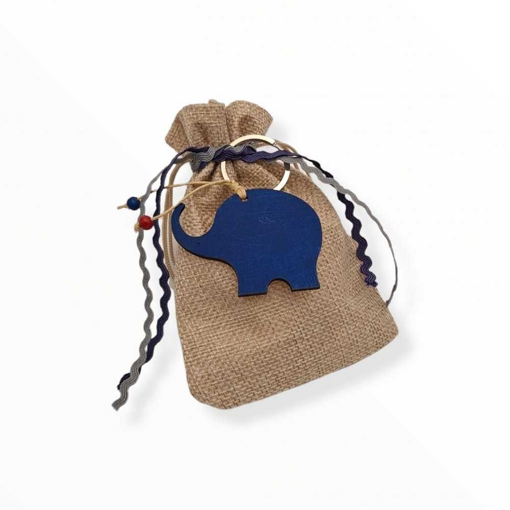 Ξεχωριστή χειροποίητη μπομπονιέρα βάφτισης σε πουγκί διακοσμημένο με κορδελάκια και ξύλινο μπρελόκ ελεφαντάκι βαμμένο στο χέρι και διακοσμημένο με χάντρες!