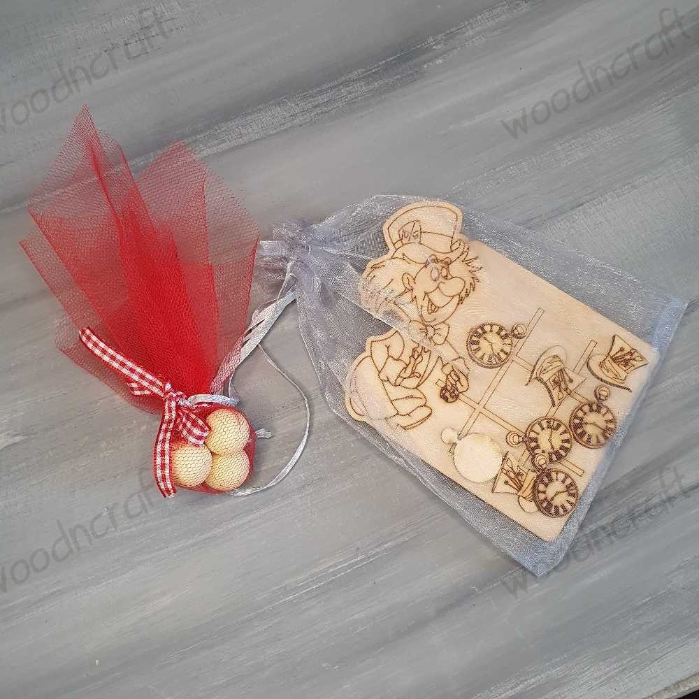Μοναδική χειροποίητη παιδική μπομπονιέρα βάφτισης με ξύλινη τρίλιζα που έχει προσαρμοσμένο τον Τρελοκαπελά από την Αλίκη στην χώρα των θαυμάτων, περασμένη σε πουγκάκι. Η μπομπονιέρα διακοσμείται με κορδελάκι και περιέχει 3 κουφέτα της επιλογής σας δεμένα σε χρωματιστό τούλι! Το αγαπημένο παιχνίδι μικρών και μεγάλων έτοιμο να προσθέσει την πιο ξεχωριστή πινελιά στη διακόσμηση της βάπτισης!