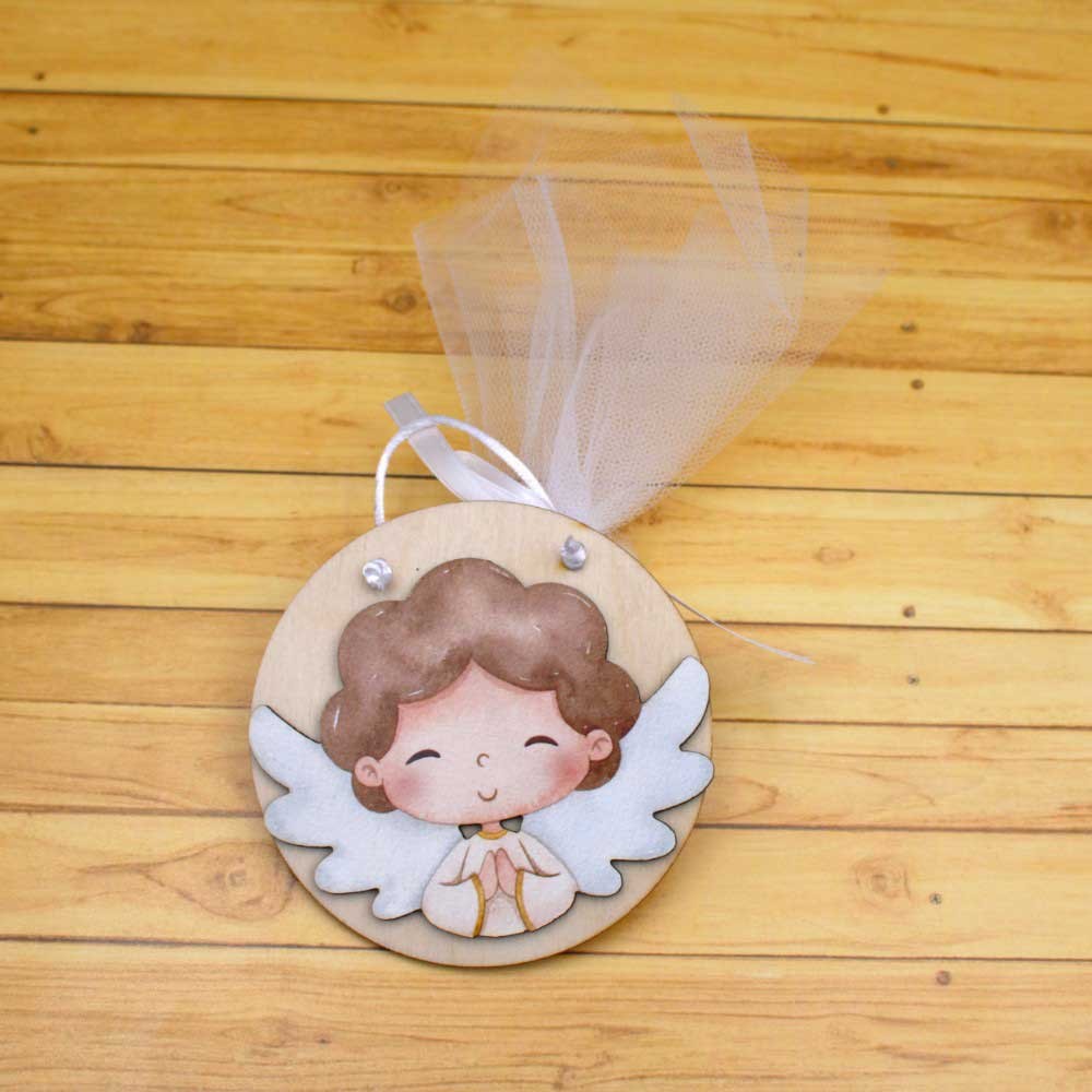Αγγίξτε την ομορφιά της απλότητας με τις χειροποίητες μπομπονιέρες μας.  Ένα στρογγυλό ξύλινο καδράκι, διαμέτρου10 εκατοστών, αποτελεί ιδανικό σκηνικό για ένα αγγελάκι από ξύλο ζωγραφισμένο με την τεχνική της UV εκτύπωσης. Η λεπτομέρεια και η ποιότητα της κατασκευής αποτυπώνουν την αγάπη και την φροντίδα που βάζουμε σε κάθε δημιουργία μας!  Τα κουφέτα αμυγδάλου ή τα πολύχρωμα κρίσπις ,τυλιγμένα σε τούλι και δεμένα με σατέν κορδέλα, προσθέτουν μια απαλή και ρομαντική πινελιά.