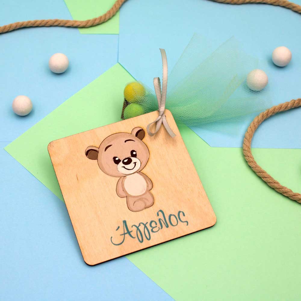 Μπομπονιέρα ξύλινο σουβέρ - Αρκουδάκι με όνομα