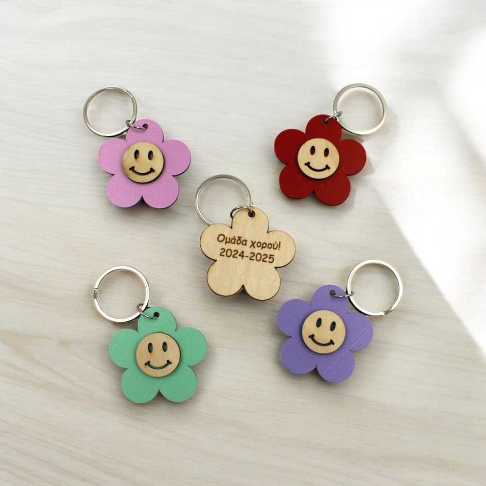 Πρωτότυπα μπρελόκ σε σχέδιο λουλούδι βαμμένα στα χρώματα της επιλογής σας και στην πίσω όψη χαραγμένα τα ονόματα των παιδιών, φτιαγμένα με διπλό ξύλο και βαμμένα στο χέρι..Ιδανικό δωράκι για τα παιδάκια στο πάρτι..