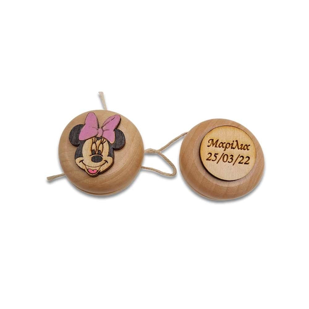 Ξύλινα γιο γιο με θέμα την αγαπημένη μας minnie mouse στην πίσω όψη υπάρχει η δυνατότητα να γραφτούν τα ονόματα των παιδιών. Στα αγορίστικα ονόματα μπαίνει αντίστοιχα ο mickey mouse..Ιδανικό δωράκι για τα παιδιά στο πάρτι..