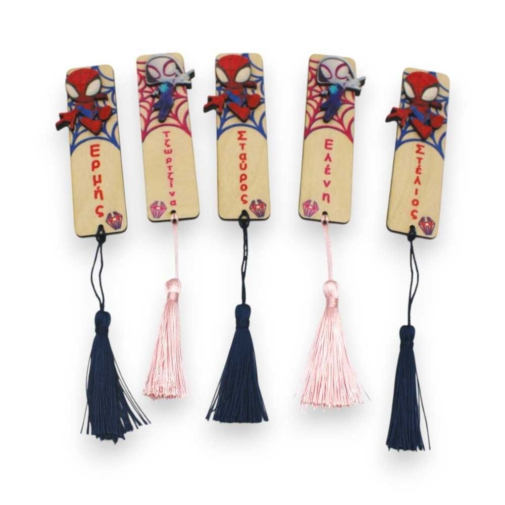 Ξύλινoi σελιδοδείκτες με χαραγμένα ονόματα και θέμα spiderman.Βαμμένοι στο χέρι και διακοσμημένοι με κόκκινη φούντα..Ιδανικό δώρο για τα παιδιά στο πάρτι..