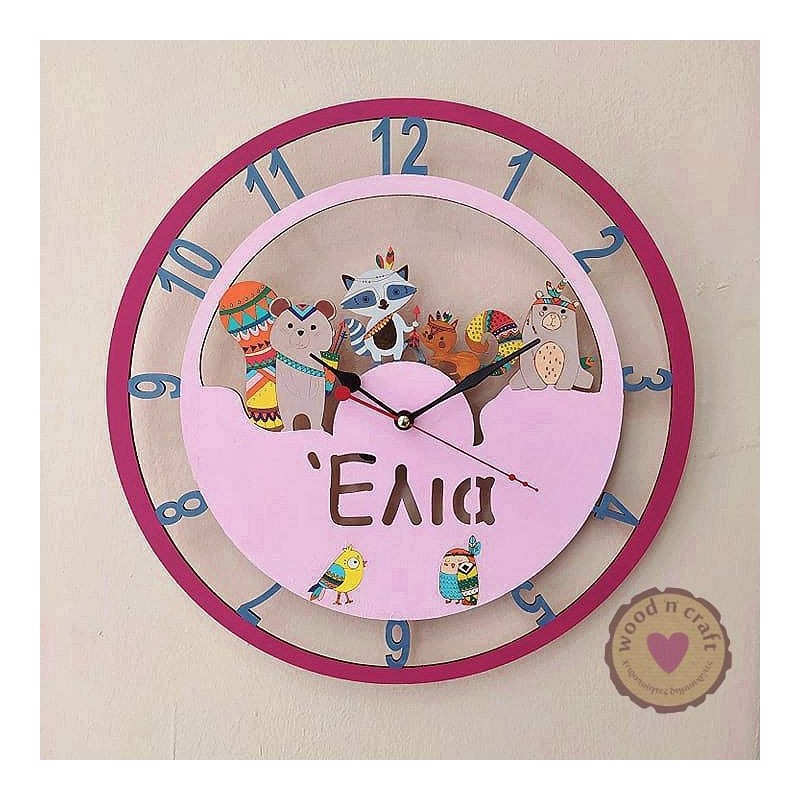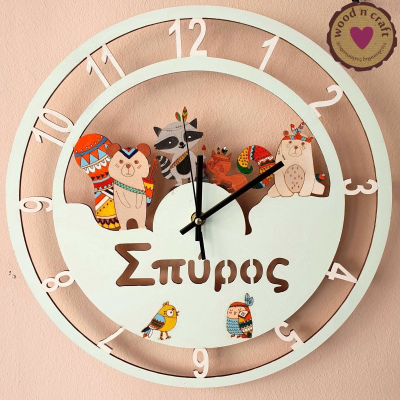Μοναδικό ξύλινο χειροποίητο παιδικό ρολόι τοίχου με θέμα τα αγαπημένα ethnic ζωάκια! Ένα ιδιαίτερο ρολόι σε στρόγγυλο σχήμα που περιμετρικά του έχουν προσαρμοστεί οι αριθμοί της ώρας, στο κέντρο του μια αναπαράσταση με ζωάκια ινδιάνους και από κάτω το όνομα του παιδιού!