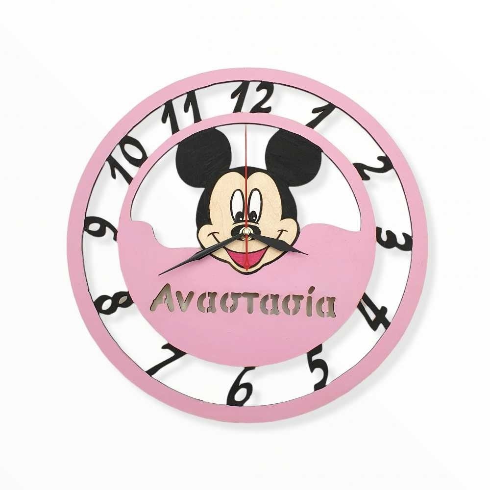 Πρωτότυπο ξύλινο χειροποίητο παιδικό ρολόι τοίχου με θέμα Μίκυ Μάους! Ένα ιδιαίτερο ρολόι σε στρόγγυλο σχήμα που περιμετρικά του έχουν προσαρμοστεί οι αριθμοί της ώρας, στο κέντρο του το κεφάλι του αγαπημένου Μίκυ και ακριβώς από κάτω το όνομα της επιλογής σας σε διάτρητη μορφή!