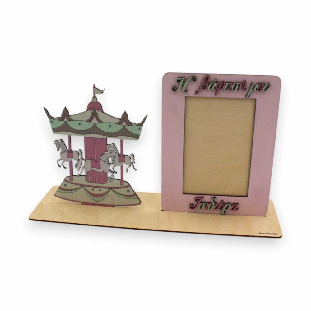 Ξύλινο παιδικό χειροποίητο σταντ κορνίζα με διακοσμητική φιγούρα καρουζέλ! Βάφεται στο χέρι σε χρώματα της επιλογής σας. Ιδανικό διακοσμητικό για το παιδικό δωμάτιο, για στολισμό βάφτισης αλλά και για δωράκι σε μωρό! Στην κορνίζα μπορεί να μπει το όνομα της επιλογής σας ή φράση όπως "η βάφτισή μου", "τα πρώτα μου γενέθλια" κ.ο.κ.