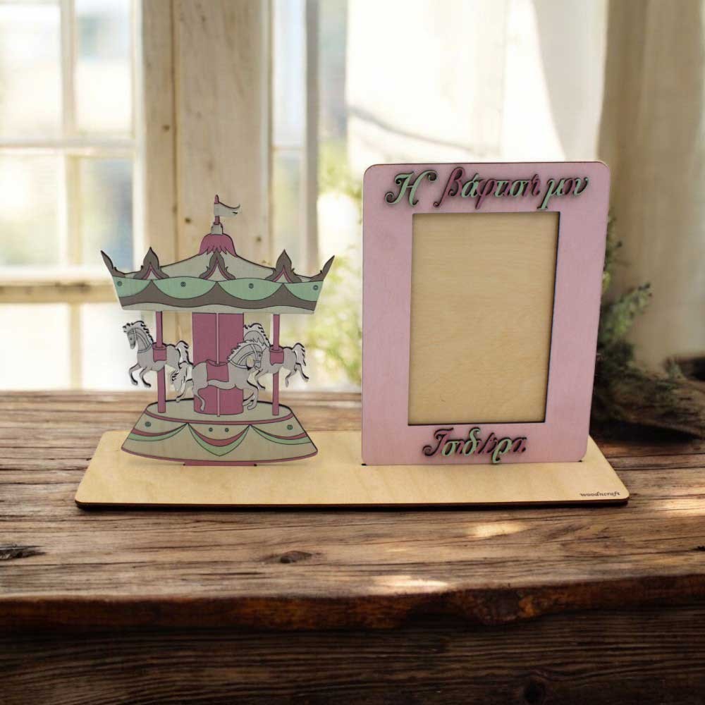 Ξύλινο παιδικό χειροποίητο σταντ κορνίζα με διακοσμητική φιγούρα καρουζέλ! Βάφεται σε χρώματα της επιλογής σας. Ιδανικό διακοσμητικό για το παιδικό δωμάτιο, για στολισμό βάφτισης αλλά και για δωράκι σε μωρό! Στην κορνίζα μπορεί να μπει το όνομα της επιλογής σας ή φράση όπως "η βάφτισή μου", "τα πρώτα μου γενέθλια" κ.ο.κ.