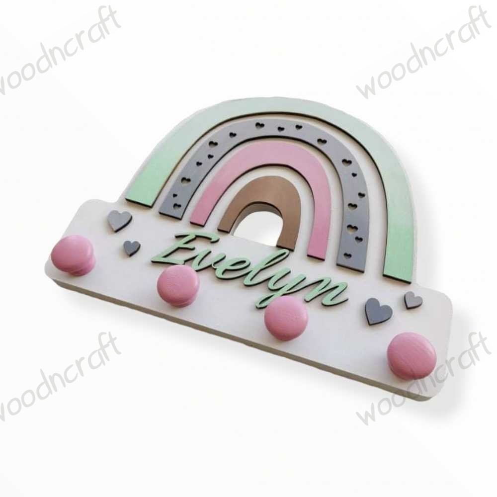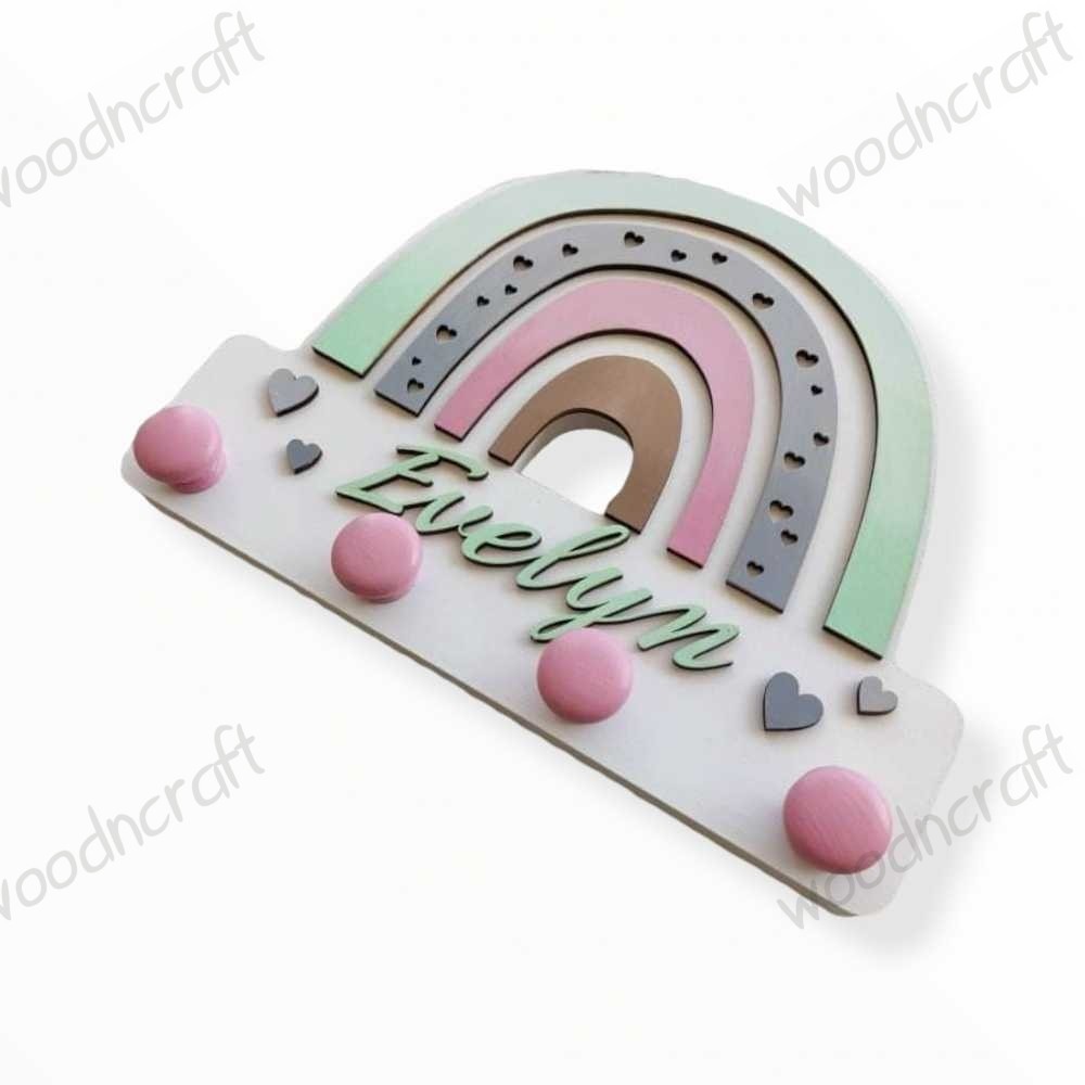 Μοναδική ξύλινη χειροποίητη παιδική κρεμάστρα σε σχέδιο ουράνιο τόξο, βαμμένη στο χέρι και προσωποποιημένη με το όνομα της επιλογής σας!