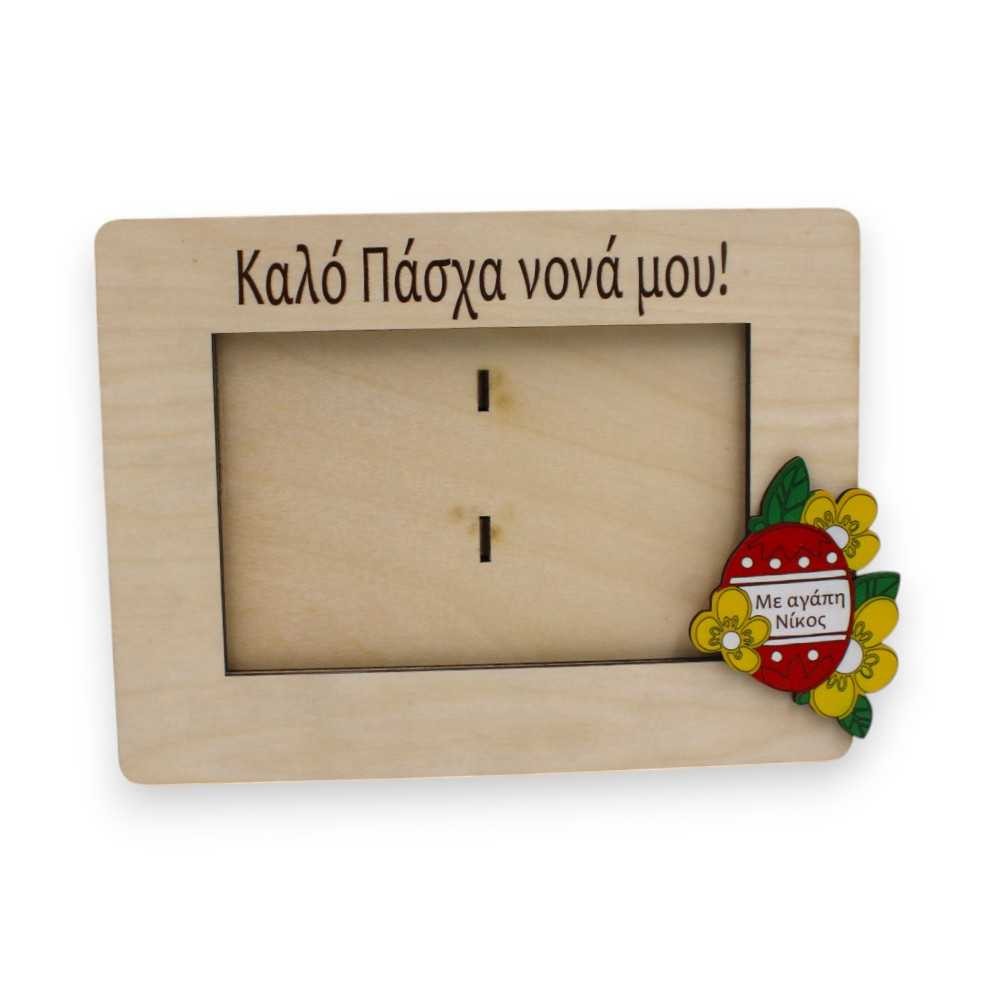Ξύλινη επιτραπέζια διακοσμητική κορνίζα με χαραγμένη αφιέρωση για τα αγαπημένα σας πρόσωπα και διακοσμημένη με ένα πασχαλινό αυγό χαραγμένο με το όνομα της επιλογής σας!