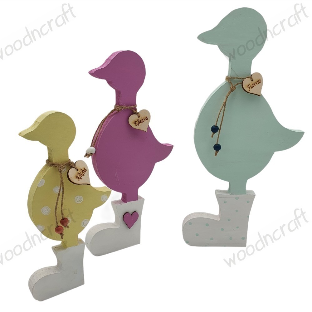 Ξύλινες χειροποίητες αυτοστηριζόμενες πάπιες με γαλότσες που συνθέτουν ένα όμορφο οικογενειακό διακοσμητικό! Βαμμένες στο χέρι στα χρώματα της επιλογής σας και διακοσμημένες και ξύλινες καρδούλες χαραγμένες με τα ονόματα της δικής σας οικογένειας και χάντρες σε ανάλογα χρώματα!