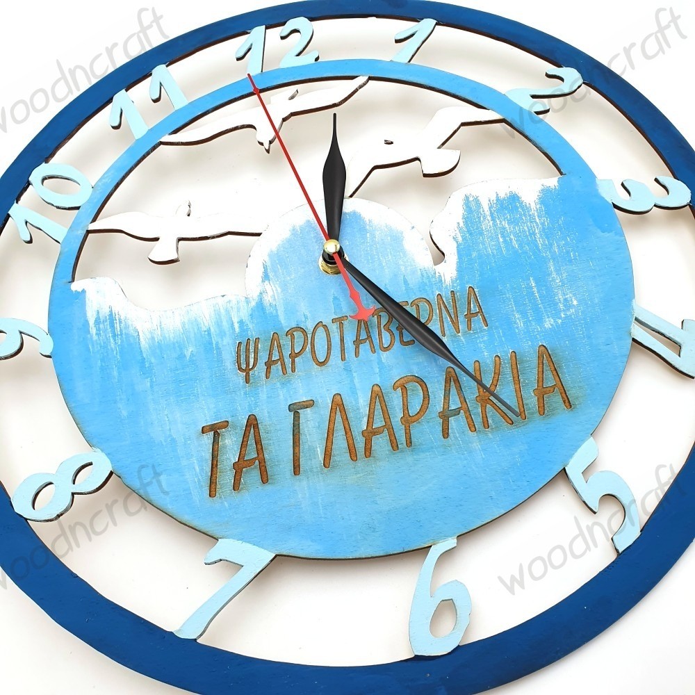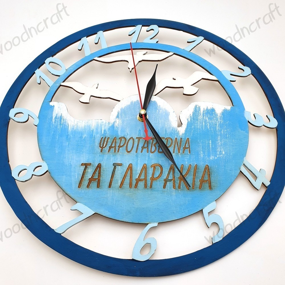 Μοναδικό ξύλινο χειροποίητο ρολόι τοίχου με προσαρμοσμένους γλάρους πάνω από μία θάλασσα με την χάραξη που προτιμάτε! Ένα ιδιαίτερο ρολόι σε στρόγγυλο σχήμα που περιμετρικά του έχουν προσαρμοστεί οι αριθμοί της ώρας, στο κέντρο του τρεις γλάροι και από κάτω η χάραξη της επιλογής σας που κάνει το κάθε ρολόι μοναδικό και ξεχωριστό!