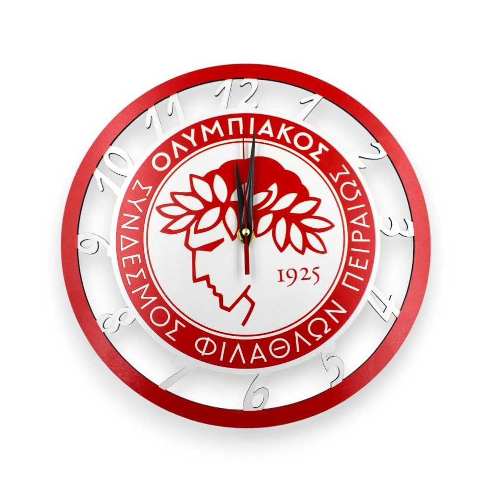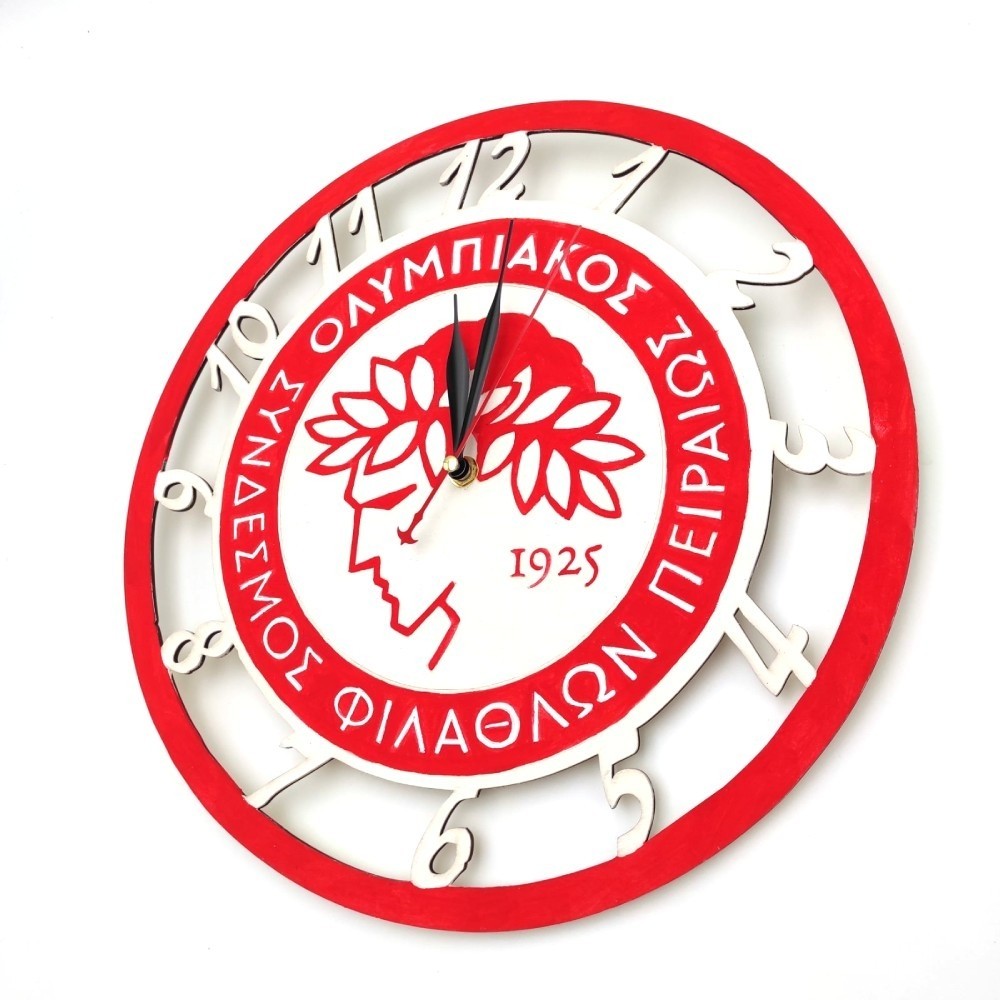 Μοναδικό ξύλινο χειροποίητο ρολόι τοίχου με προσαρμοσμένο το λογότυπο της αγαπημένης σας ομάδας! Ένα ιδιαίτερο ρολόι με το σήμα του Ολυμπιακού, σε στρόγγυλο σχήμα που περιμετρικά του έχουν προσαρμοστεί οι αριθμοί της ώρας! Ιδανικό για δώρο ή για την διακόσμηση του χώρου σας.