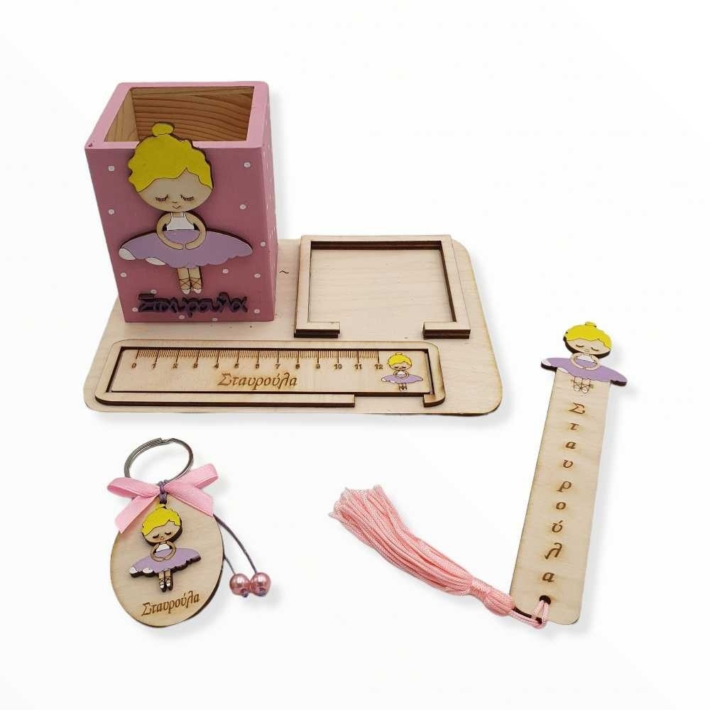 Χειροποίητο μαθητικό σετ γραφείου αποτελούμενο από ξύλινο χάρακα, χαρτάκια post it, σελιδοδείκτη, μπρελόκ και μολυβοθήκη με ένα κοριτσάκι μπαλαρίνα και φυσικά το όνομα που θα επιλέξετε που θα κάνει το δωράκι σας μοναδικό και ξεχωριστό!