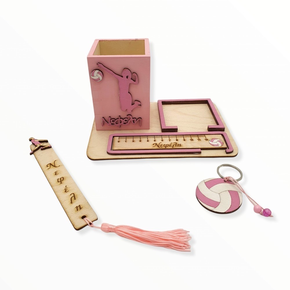 Μοναδικό χειροποίητο μαθητικό σετ γραφείου αποτελούμενο από ξύλινο χάρακα, χαρτάκια post it, σελιδοδείκτη, μπρελόκ και μολυβοθήκη με θέμα το βόλεϊ και φυσικά το όνομα της επιλογής σας.