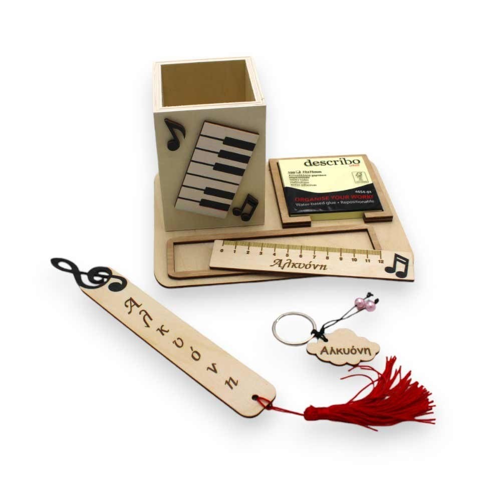 Μοναδικό χειροποίητο μαθητικό σετ γραφείου αποτελούμενο από ξύλινο χάρακα, χαρτάκια post it, σελιδοδείκτη, μπρελόκ και μολυβοθήκη με θέμα την μουσική και χάραξη ονόματος της επιλογής σας!