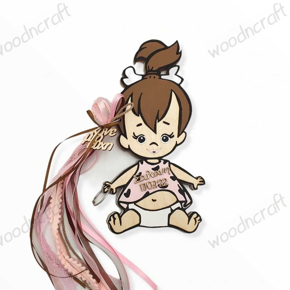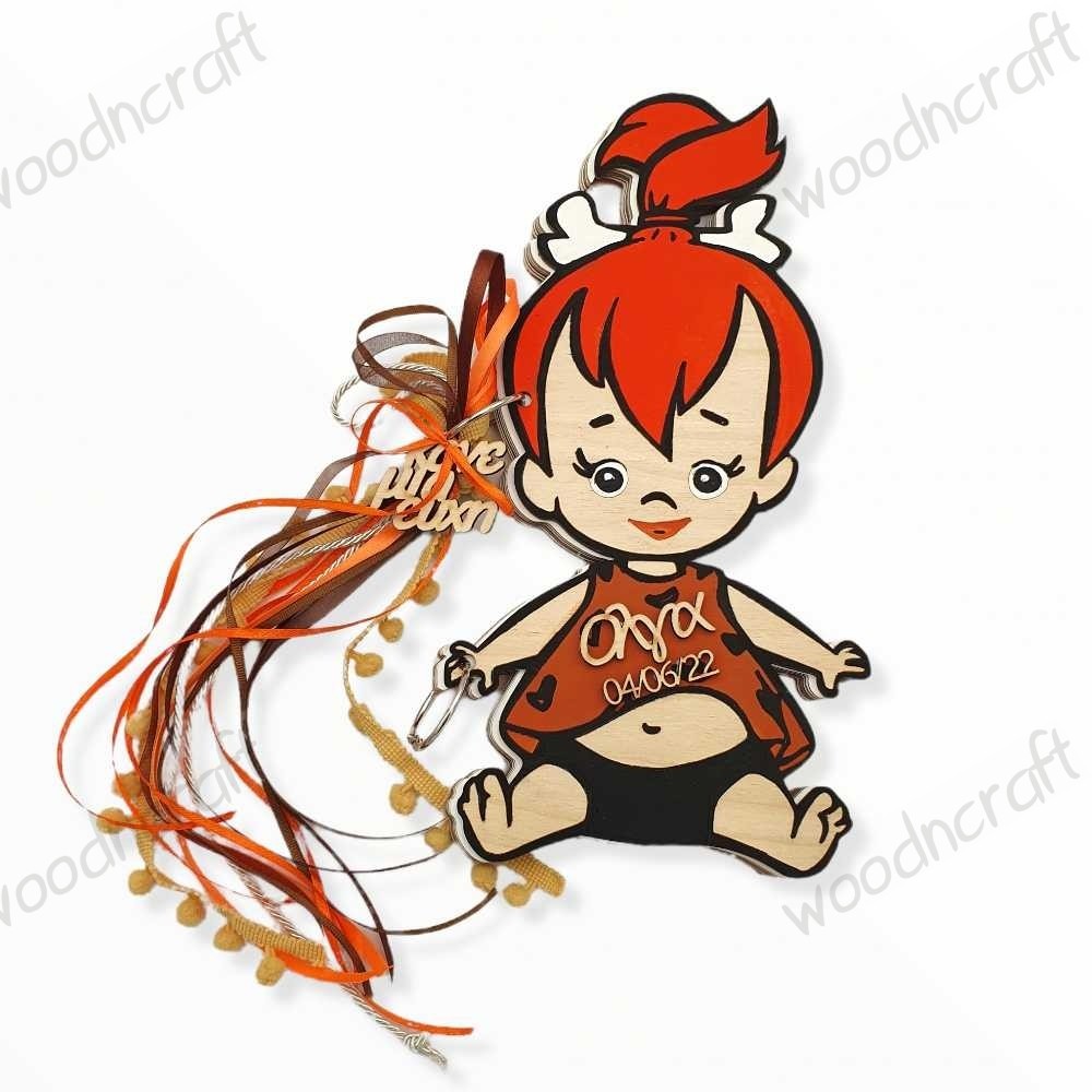 Ξύλινο χειροποίητο ευχολόγιο για στολισμό βάφτισης με την αγαπημένη Σταλίτσα από τους Flinstones! Η εκτύπωση γίνεται στα χρώματα της επιλογής σας και η διακόσμηση με ανάλογα κορδελάκια, το ξύλινο στοιχείο ''κάνε μια ευχή'' και προαιρετικά το όνομα του παιδιού και την ημερομηνία της βάφτισης ή του πάρτι.