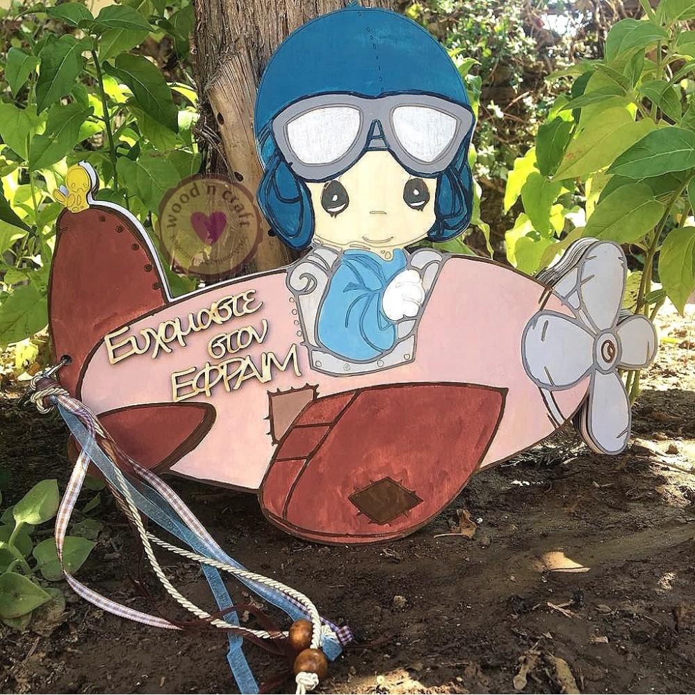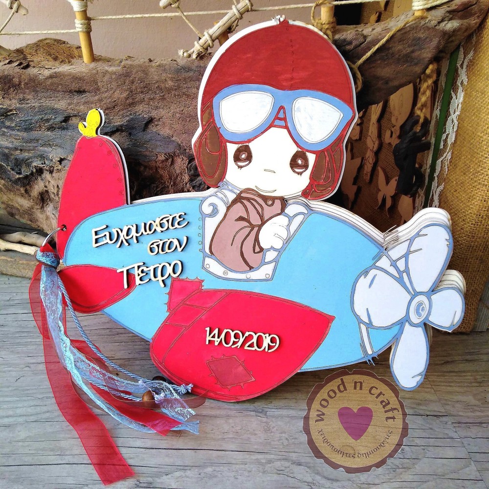 Ξύλινο χειροποίητο βιβλίο ευχών σε σχέδιο αεροπλανάκι vintage με παιδάκι πιλότο! Η εκτύπωση γίνεται στα χρώματα της επιλογής σας και η διακόσμηση με αντίστοιχες κορδέλες.