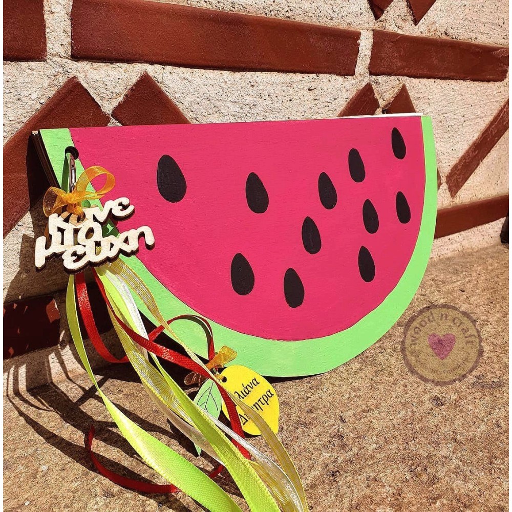 Ένα υπέροχο ξύλινο χειροποίητο βιβλίο ευχών βάφτισης σε σχέδιο καρπούζι διακοσμημένο με κορδελάκια στα χρώματα που θα επιλέξετε και ένα κρεμαστό λεμονάκι με το όνομα ή και την ημερομηνία βάπτισης του παιδιού!
