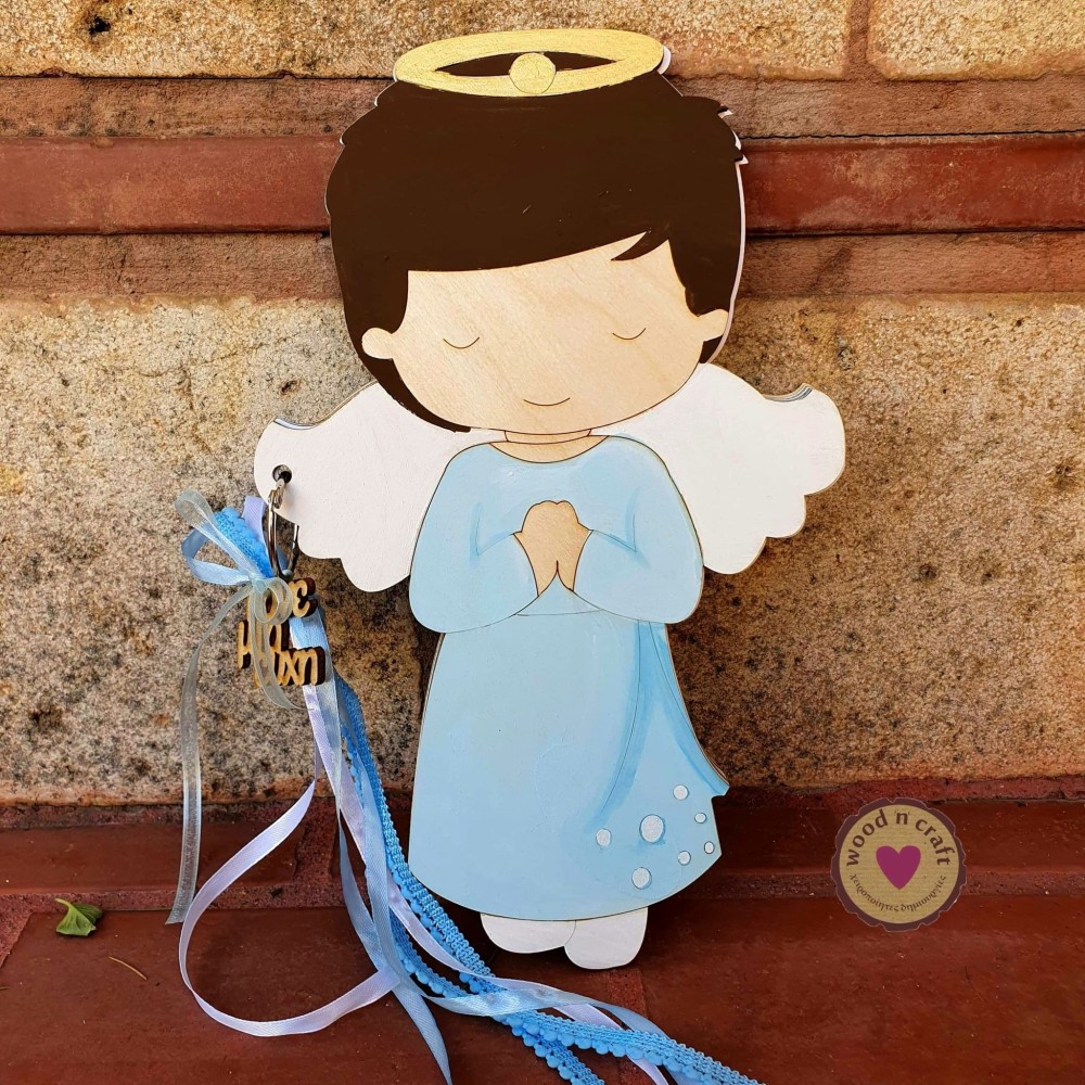 Χειροποίητο ξύλινο βιβλίο ευχών σε σχέδιο αγγελάκι. Ένα πρωτότυπο ευχολόγιο στα χρώματα της επιλογής σας διακοσμημένο με ανάλογες κορδέλες. Μοναδικό βιβλίο για να κρατήσετε της ευχές της βάφτισης ζωντανές!