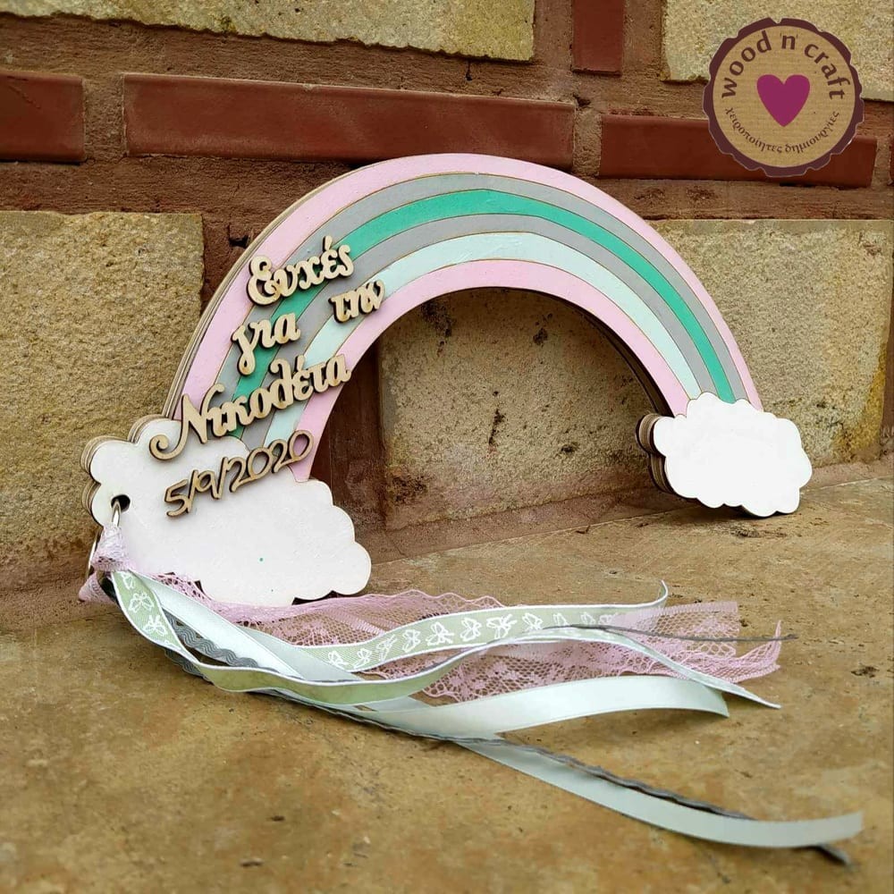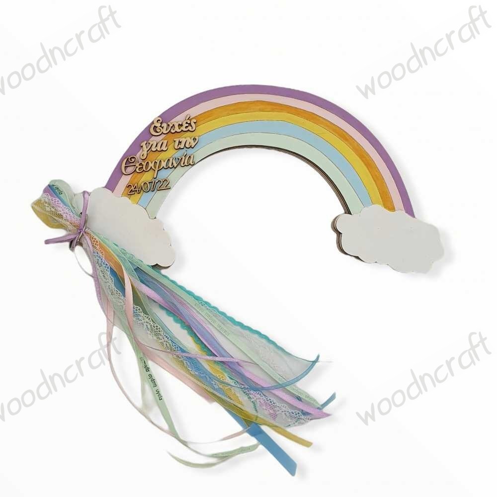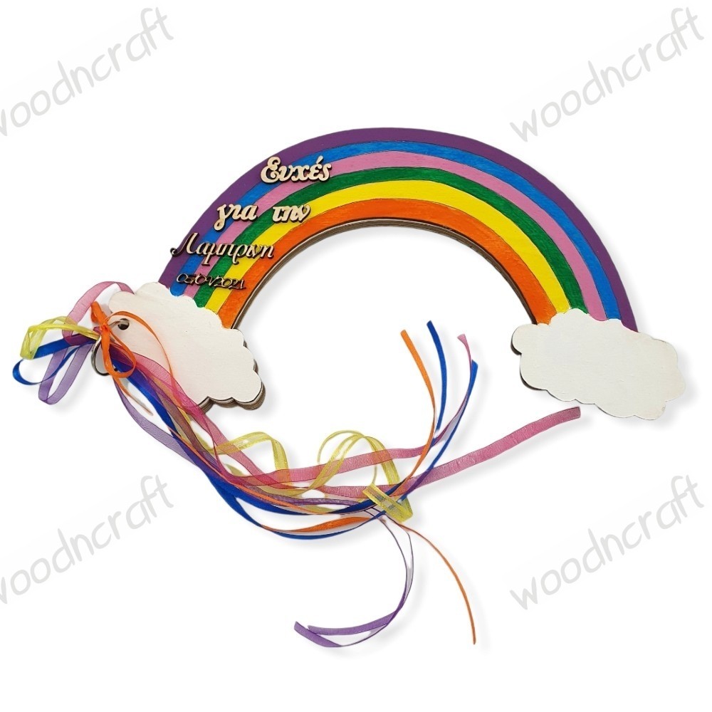 Ξύλινο χειροποίητο ευχολόγιο σε σχέδιο ουράνιο τόξο πάνω σε συννεφάκια στις αποχρώσεις που ταιριάζουν με τον στολισμό σας. Διακοσμημένο με κορδέλες, δαντέλα και ξύλινα στοιχεία με το όνομα και την ημερομηνία της επιλογής σας.