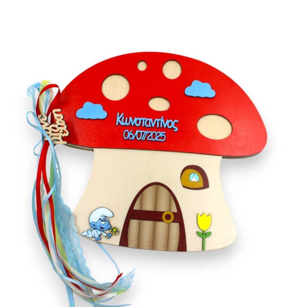 Πρωτότυπο ξύλινο χειροποίητο βιβλίο ευχών σε σχέδιο Στρουμφόσπιτο! Κατασκευάζεται στις αποχρώσεις της δικής σας προτίμησης και διακοσμείται με χρωματιστά κορδελάκια και το στρουμφάκι της επιλογής σας!